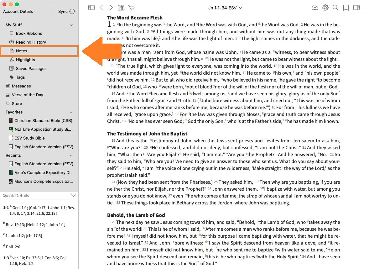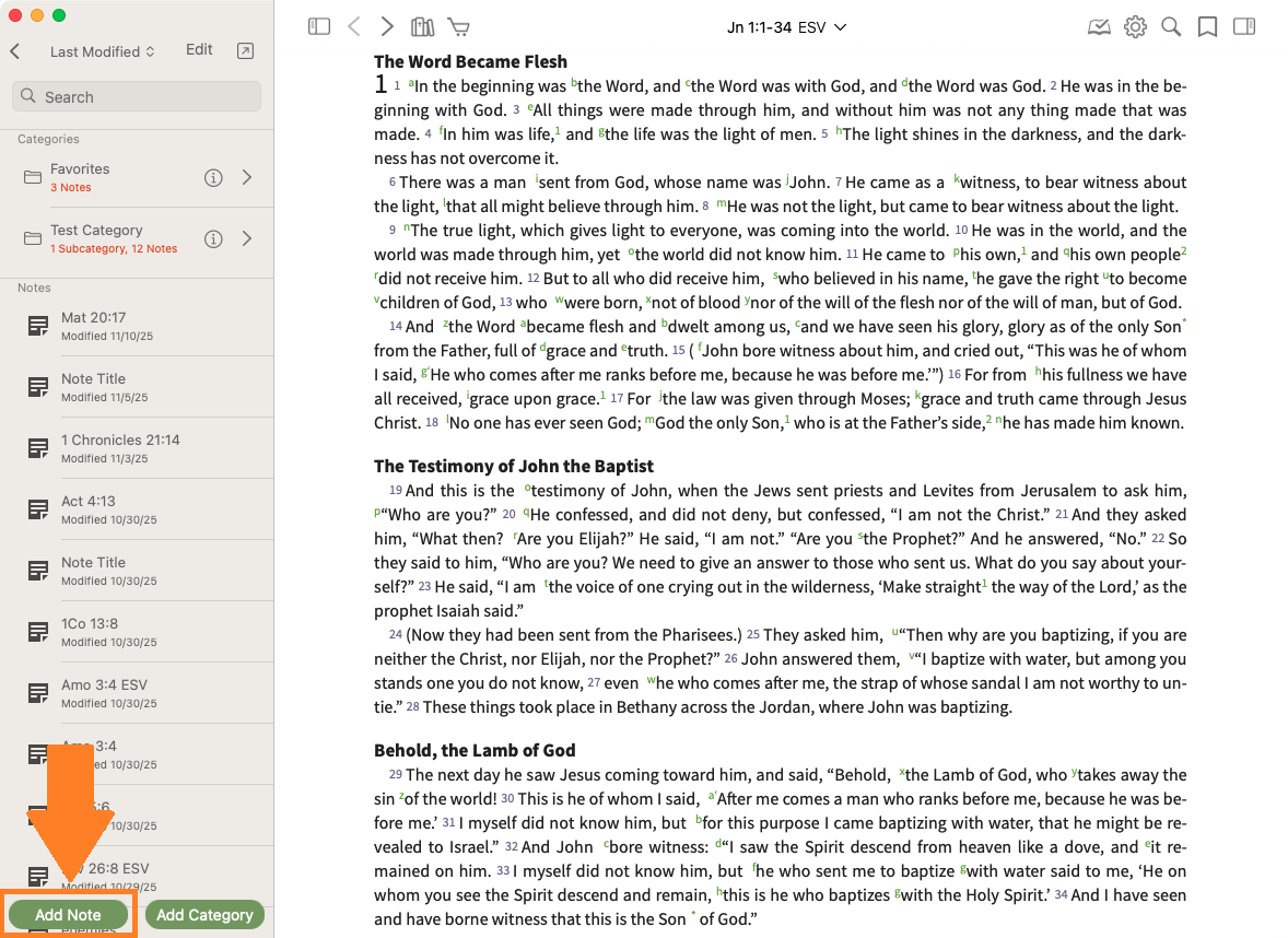 The most common way to create a note is while viewing text. As mentioned above, these notes can be tied either to a verse or to specific text. Follow these steps to create a note: