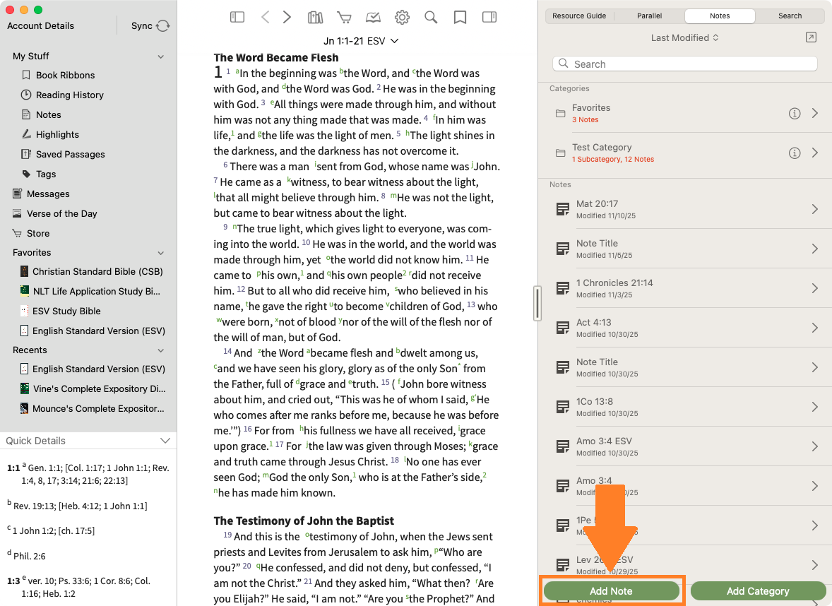 Once a note is created, it can be located in the sidebar, the Study Center, or by selecting the note icon in the text. Opening the note will provide you with the ability to edit the note. With the 'Edit Note' window open, you can change the title, add content, edit the tags, and assign the note to a category.