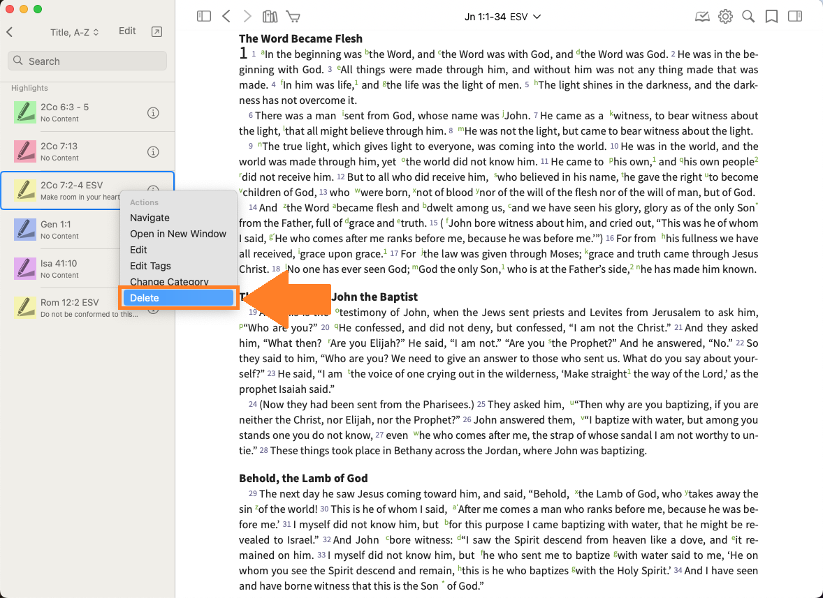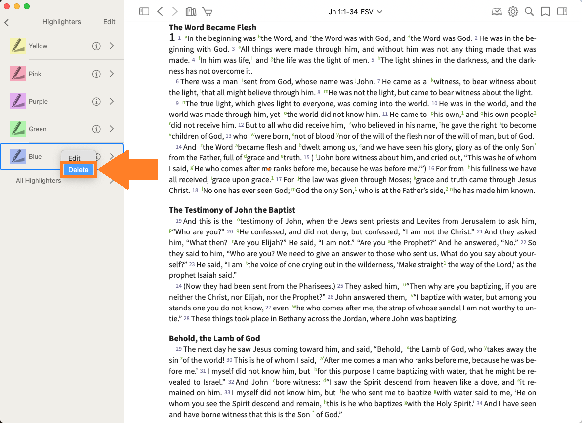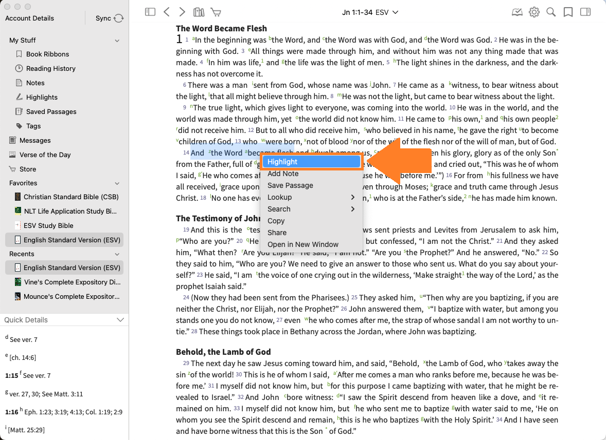 - Select a verse number or select text and then secondary click on the selected text (or hold 'control' and click). Select Highlight.