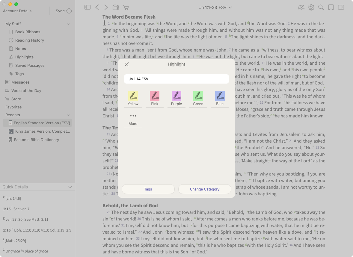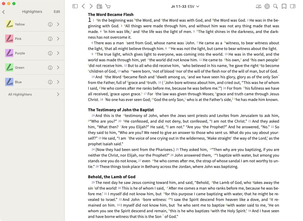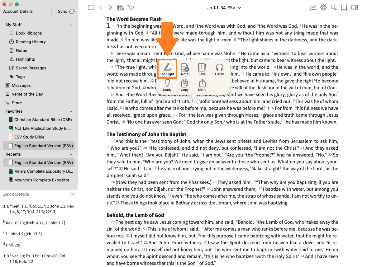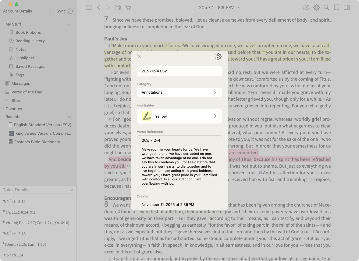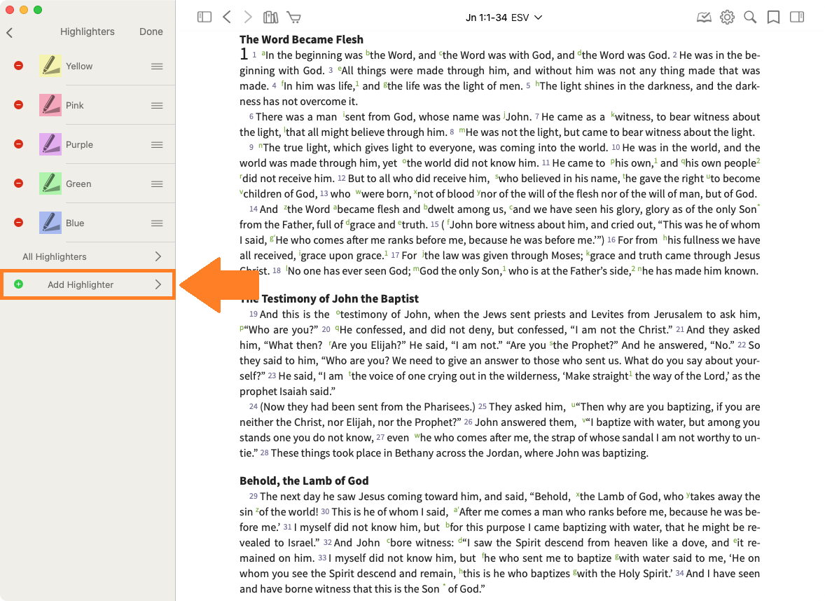 Highlights let you visually mark key words, phrases, or verses so they stand out during your Bible study. Whether you're identifying important themes, tracking repeated ideas, or simply marking a verse to revisit later, highlights provide a personal way to stay engaged with Scripture. You can also organize your highlights using tags and categories to make them easy to browse and reference later.