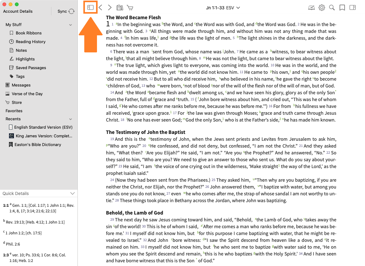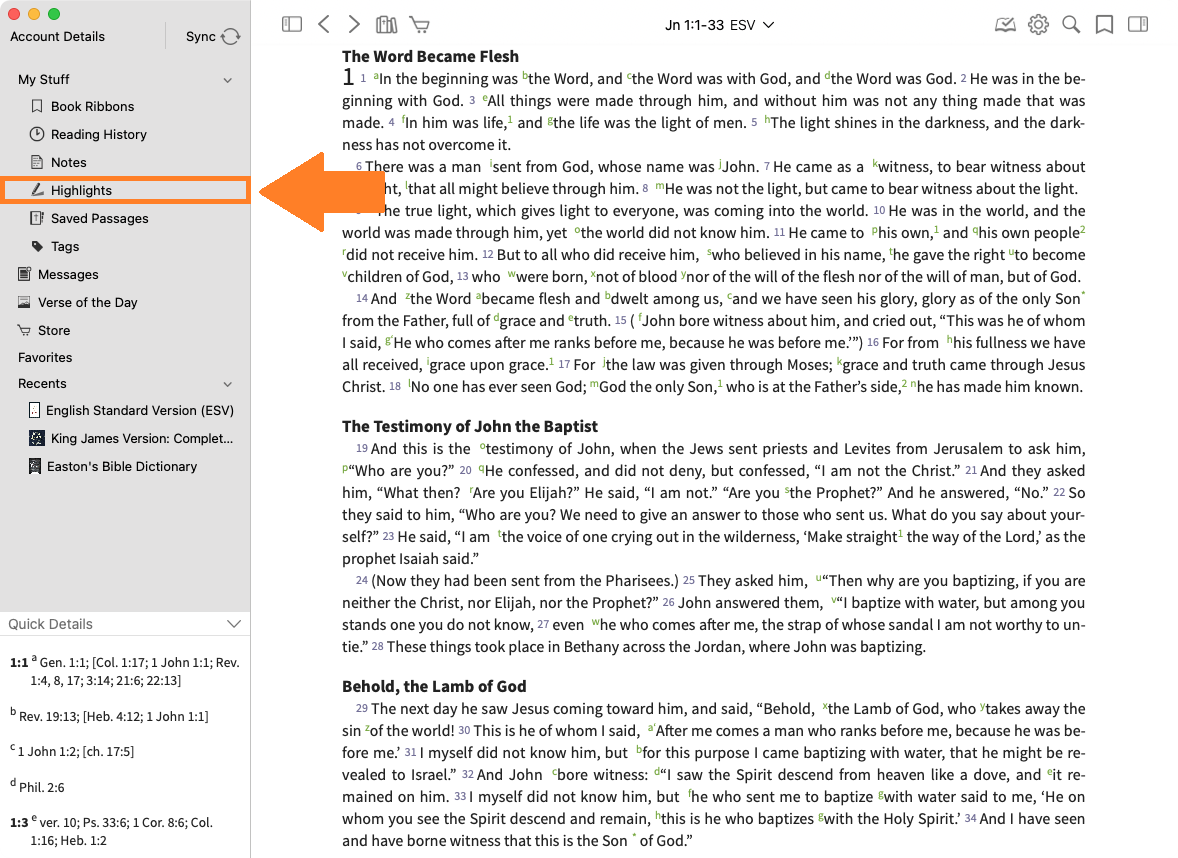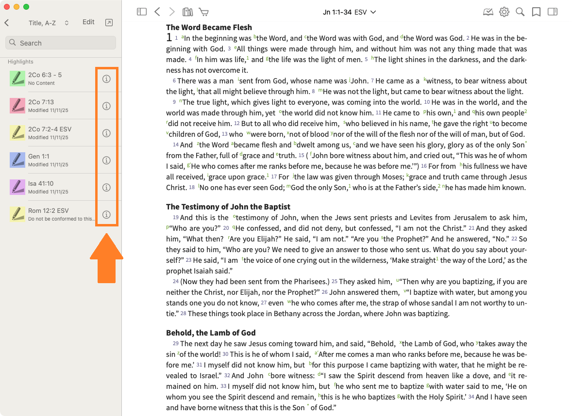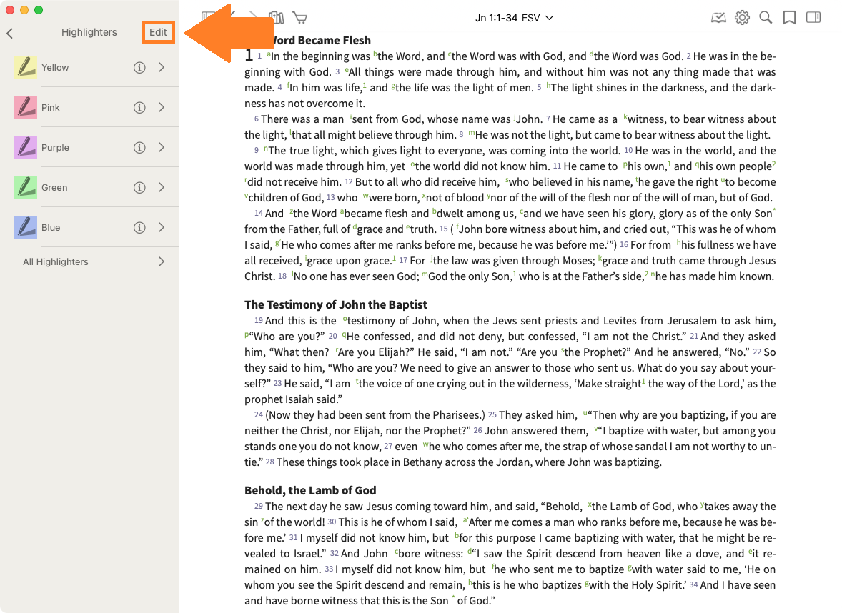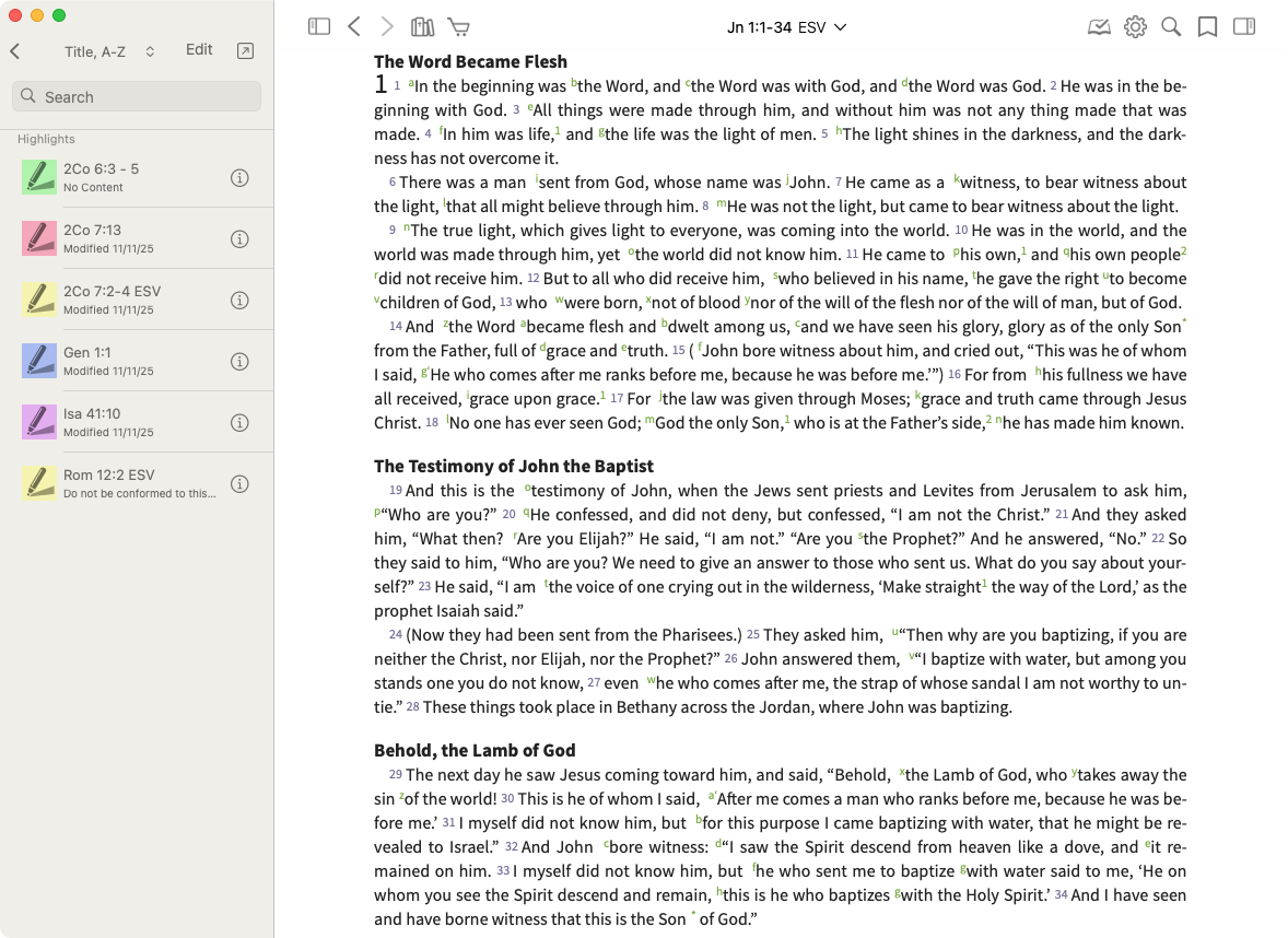 Highlights let you visually mark key words, phrases, or verses so they stand out during your Bible study. Whether you're identifying important themes, tracking repeated ideas, or simply marking a verse to revisit later, highlights provide a personal way to stay engaged with Scripture. You can also organize your highlights using tags and categories to make them easy to browse and reference later.
