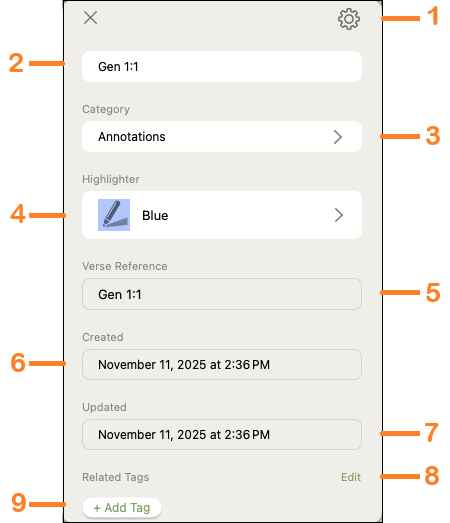 - Select the 'i' icon to the right of a highlight you wish to edit to open the edit window. Here you can change the label, assign the highlight to a category, change the highlighter color, and edit the tags. You can also perform these actions or delete the highlight by selecting the Settings icon in the upper right corner.