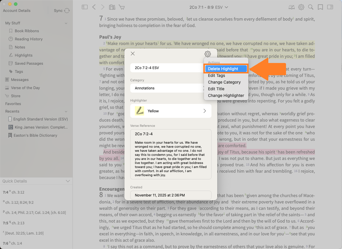 - Word-Based Highlights: Created by selecting specific text. These are tied to the exact resource where they were created (e.g., a specific Bible translation or commentary).