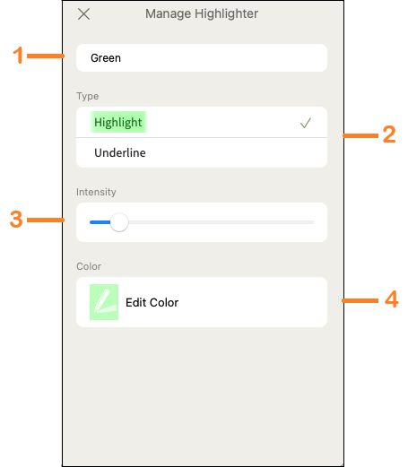 On the next screen, you can assign a label (title), choose highlight or underline, change the intensity of the color, and choose the color. Select the back arrow in the upper left corner to save the highlighter. It will now appear as an option when you add a highlight in the text.