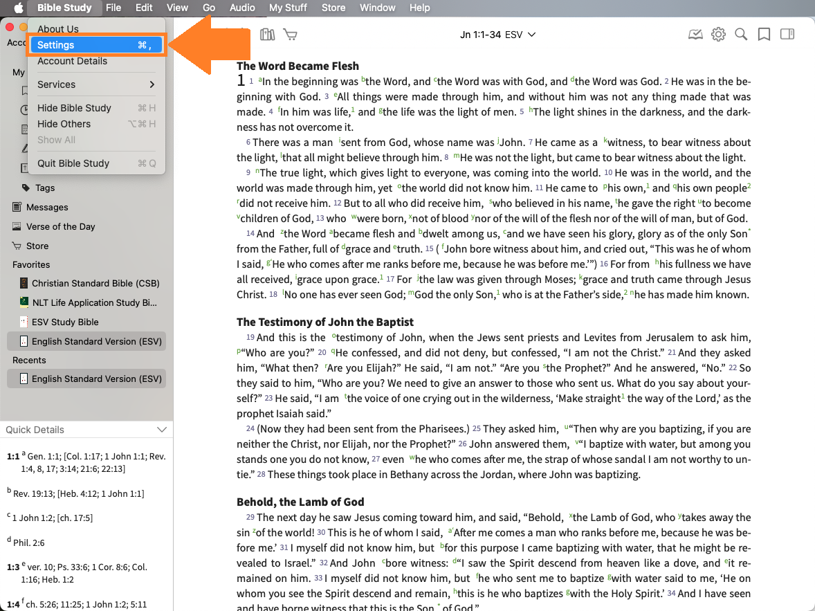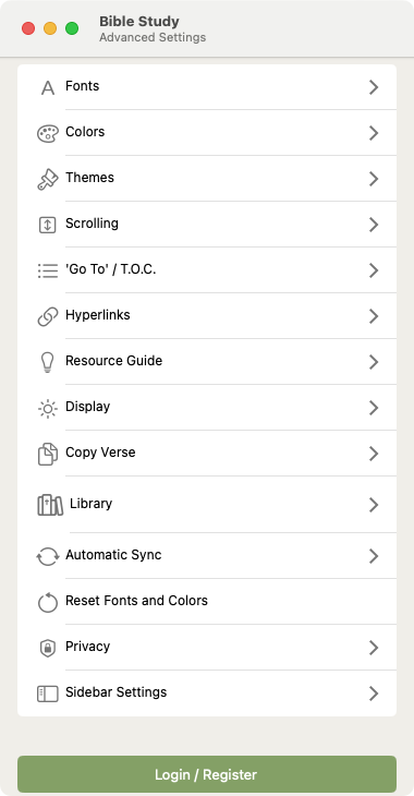 To access Advanced Settings, select Bible Study from the top menu bar, then choose Settings. You can also reach this section from the Quick Settings menu.