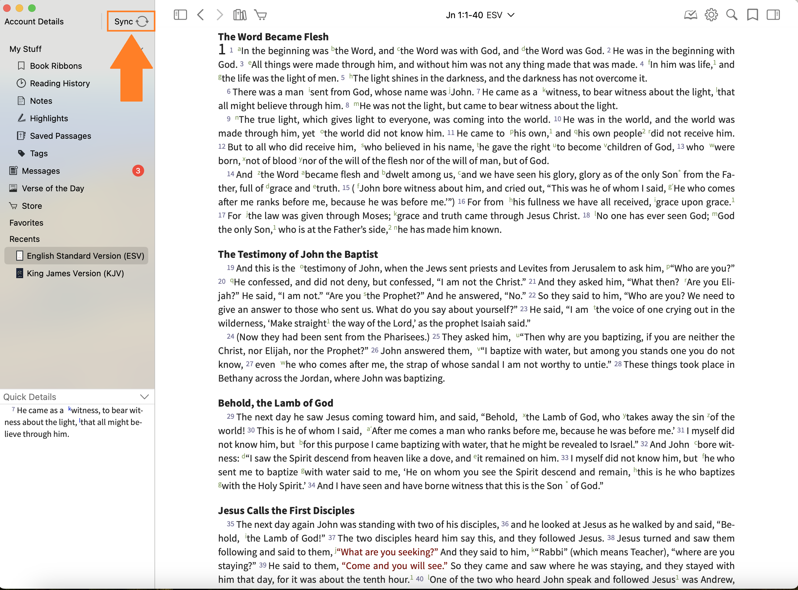 Before going through the following suggestions, we recommend that you back up any saved passages, notes, highlights, and/or book ribbons to the Olive Tree Study Sync servers. To do so, follow these steps: