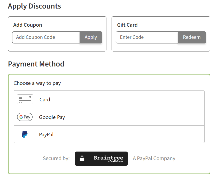 - Enter any discount codes you may have in the 'Discount Coupon' box and select 'Apply'. Choose a way to pay, and enter your payment information.