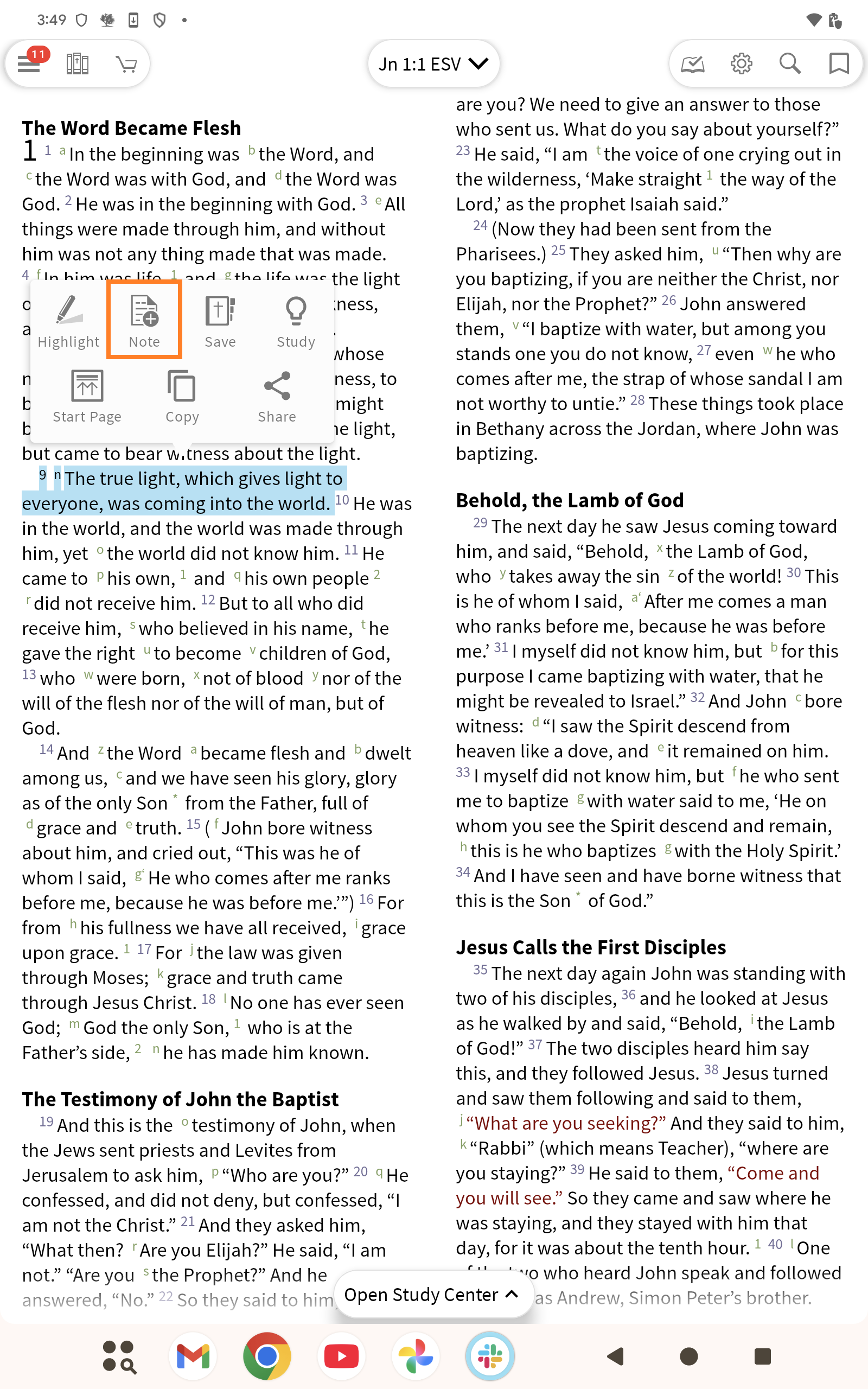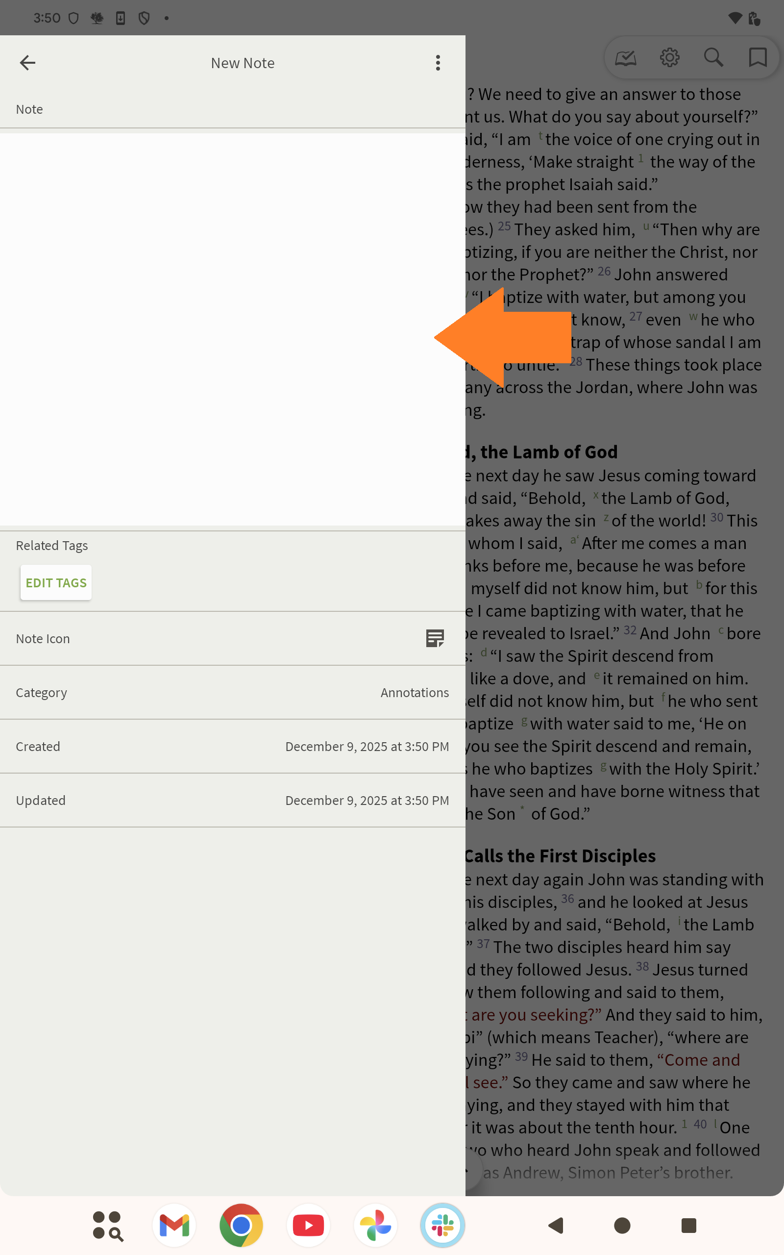 - Tap the white space to begin typing in the note. Note that verse references will be hyperlinked for easy access.