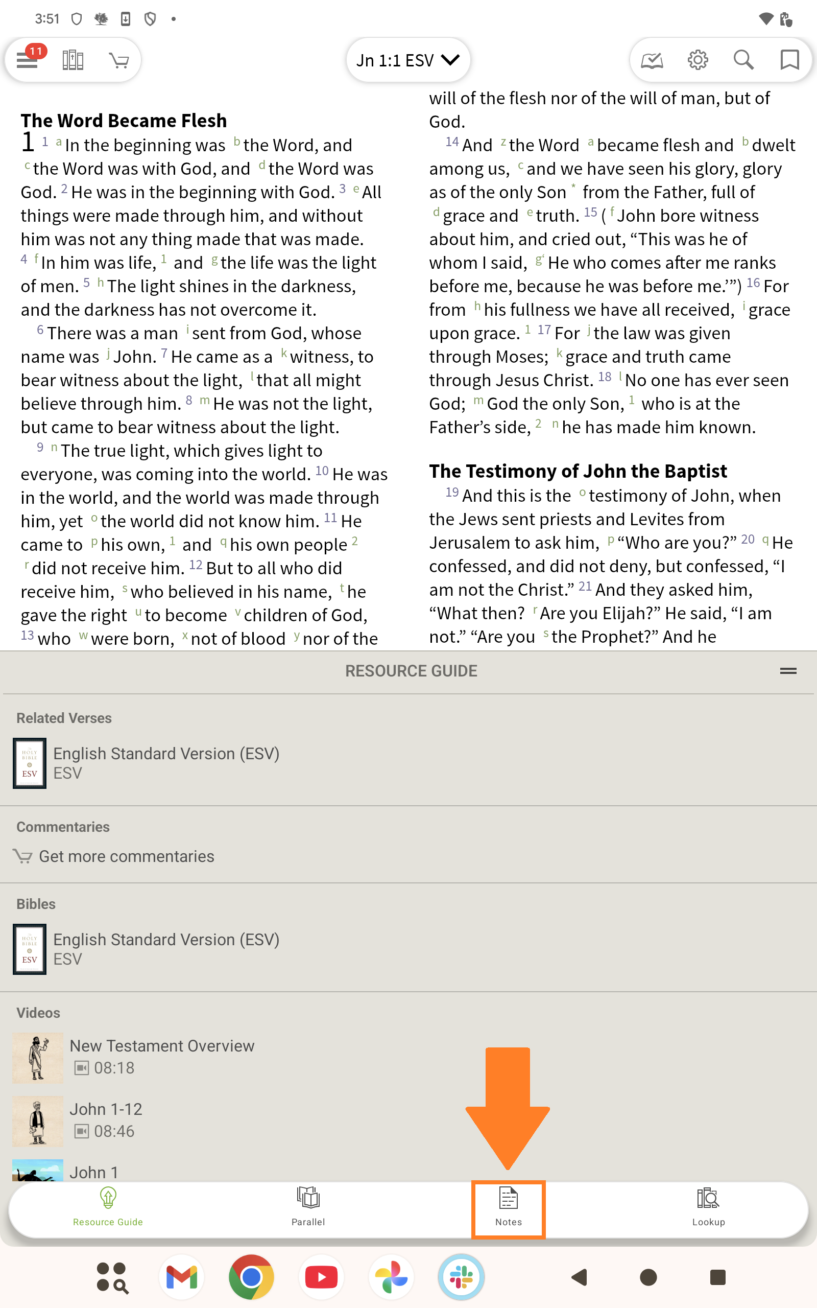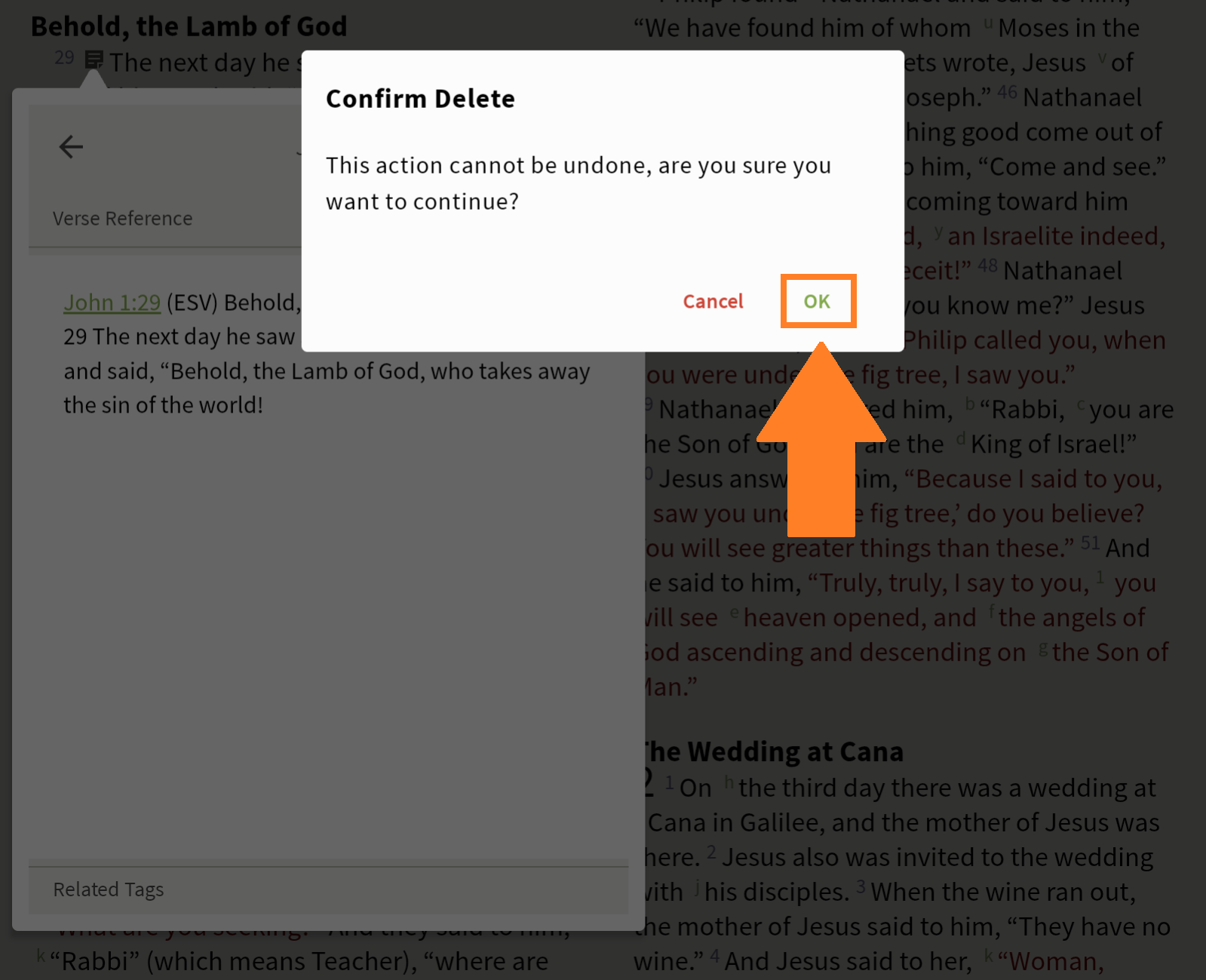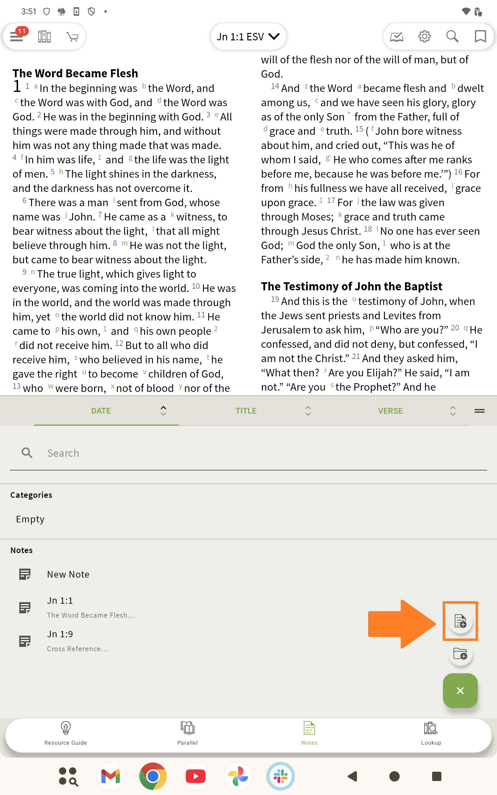 The most common way to create a note is while viewing text. As mentioned above, these notes can be tied either to a verse or to text. Follow these steps to create a note: