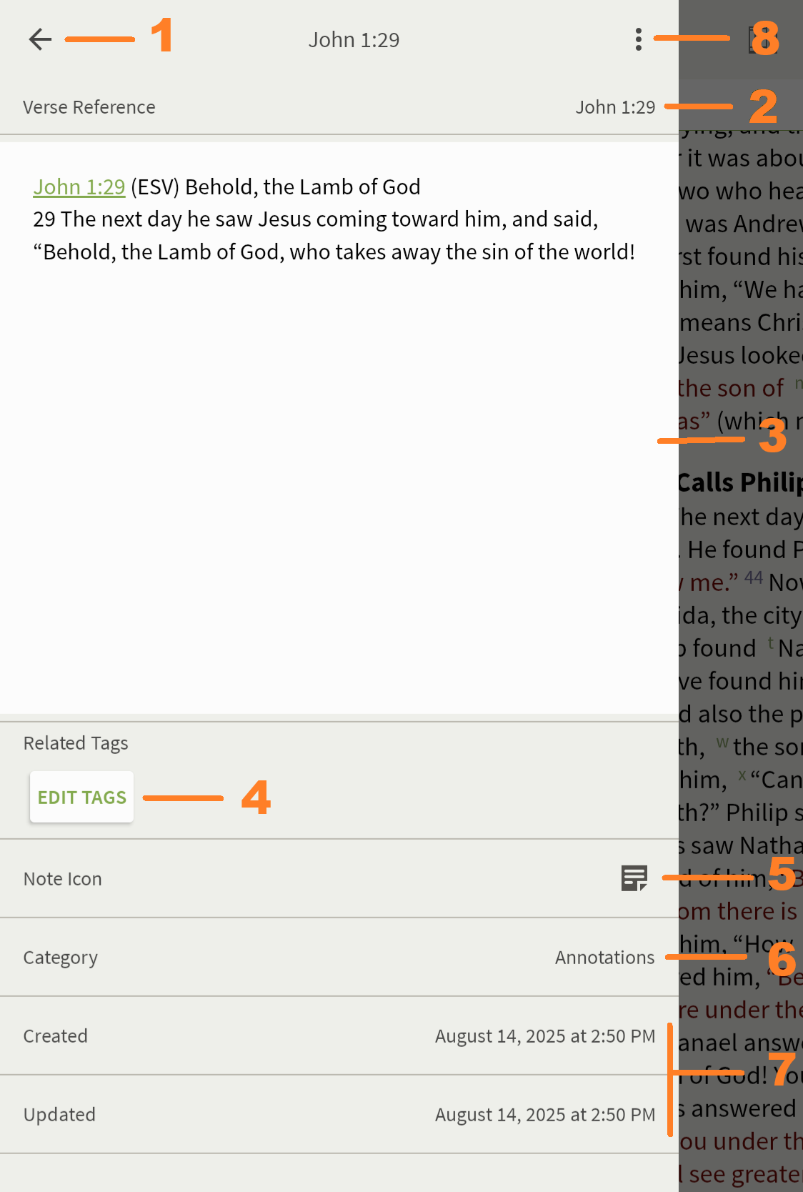 - Verse-Based Notes: Created by selecting a verse number. These notes are tied to that verse and appear across all downloaded Bible translations.