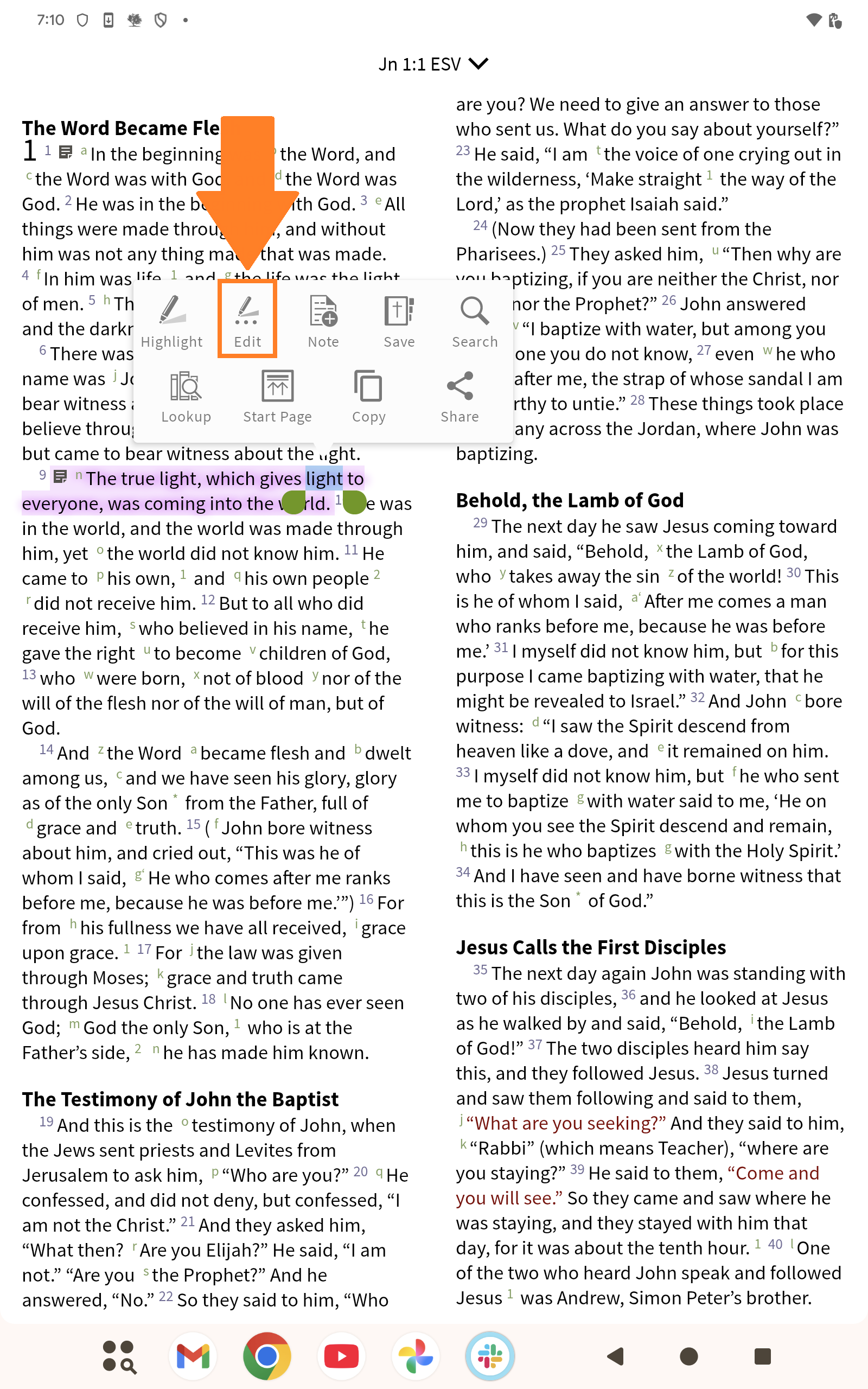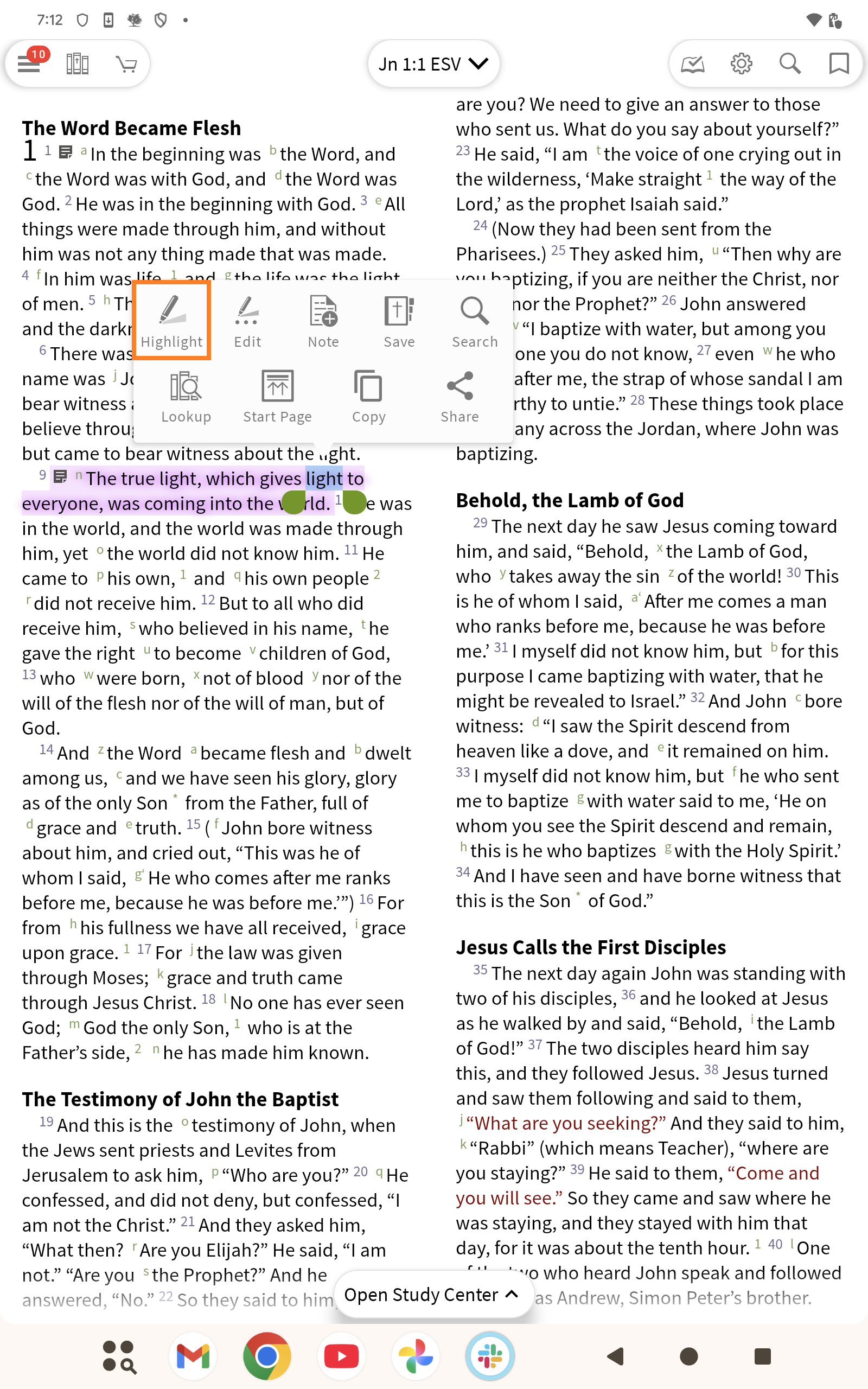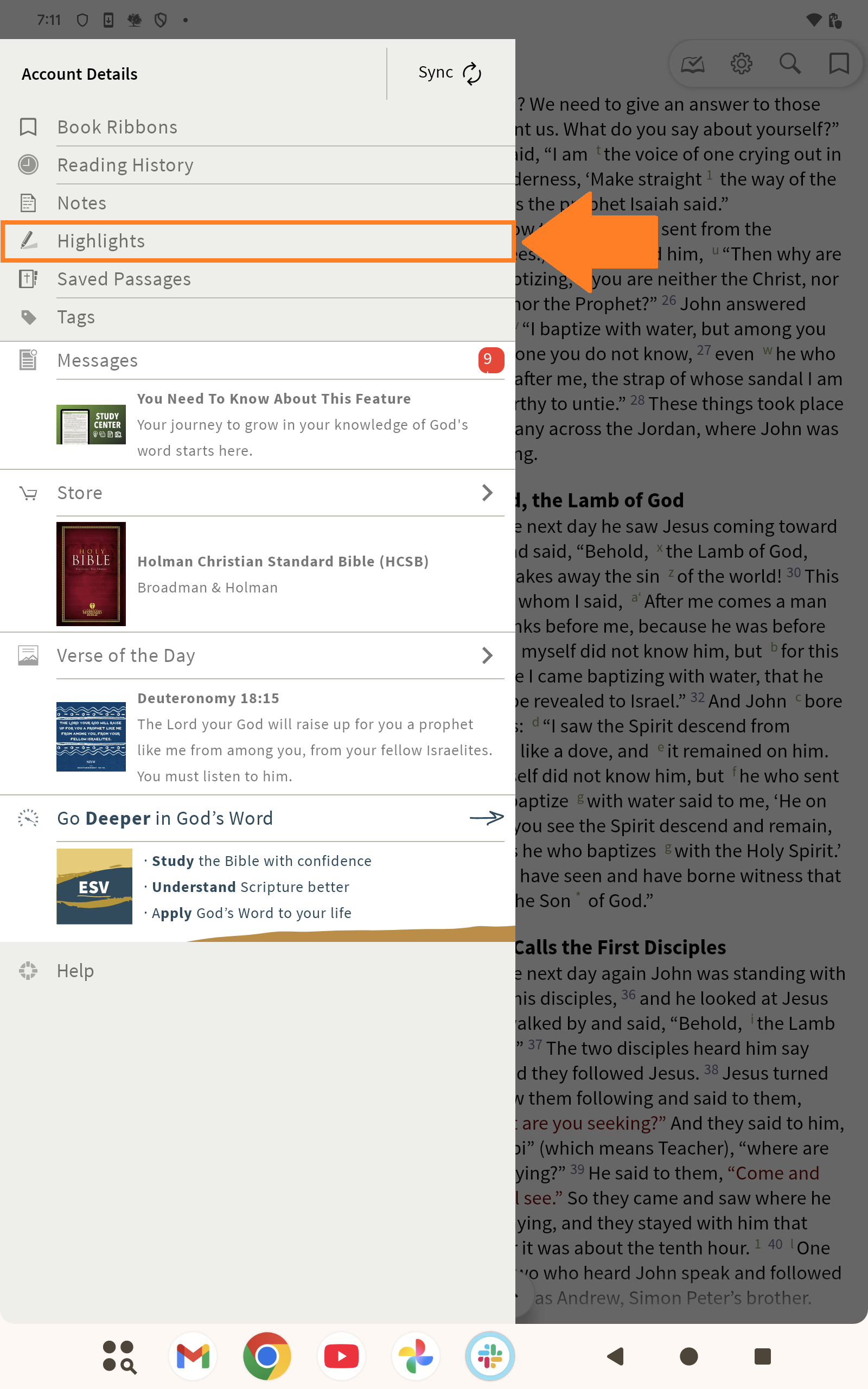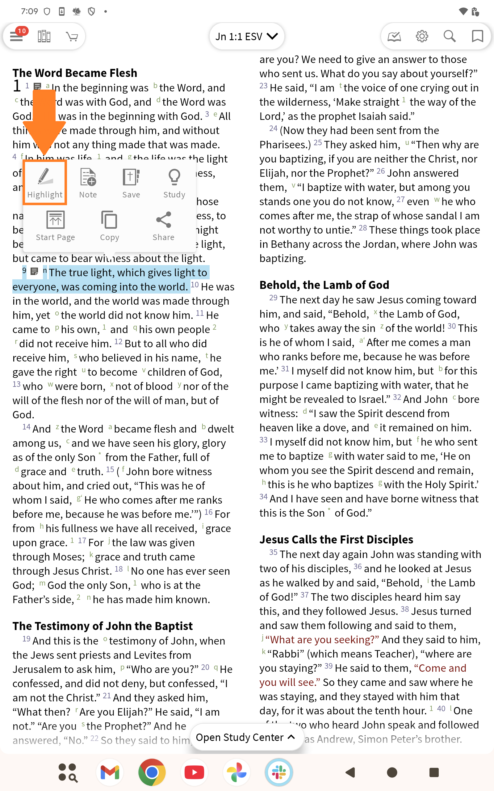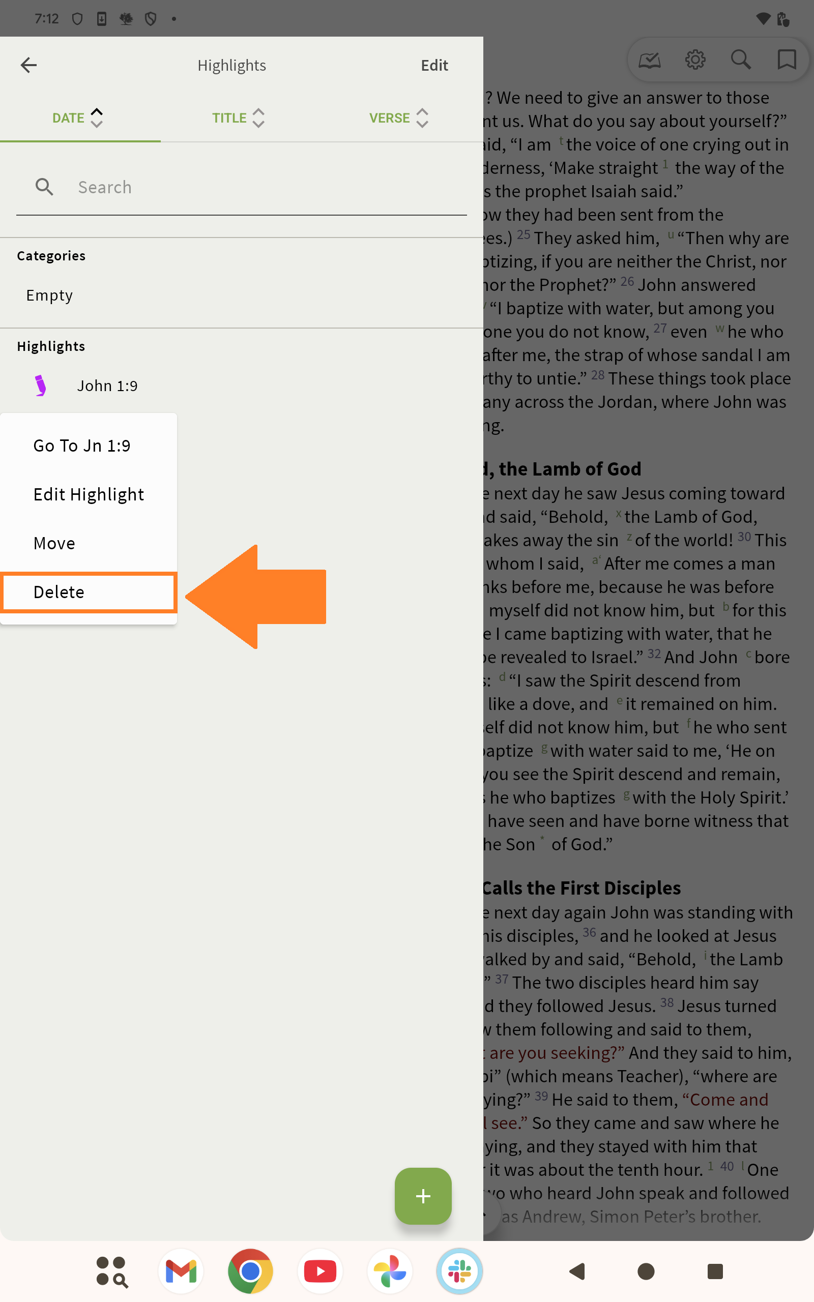 - Tap a verse number or tap and hold to select text and then select Highlight from the pop-up menu.