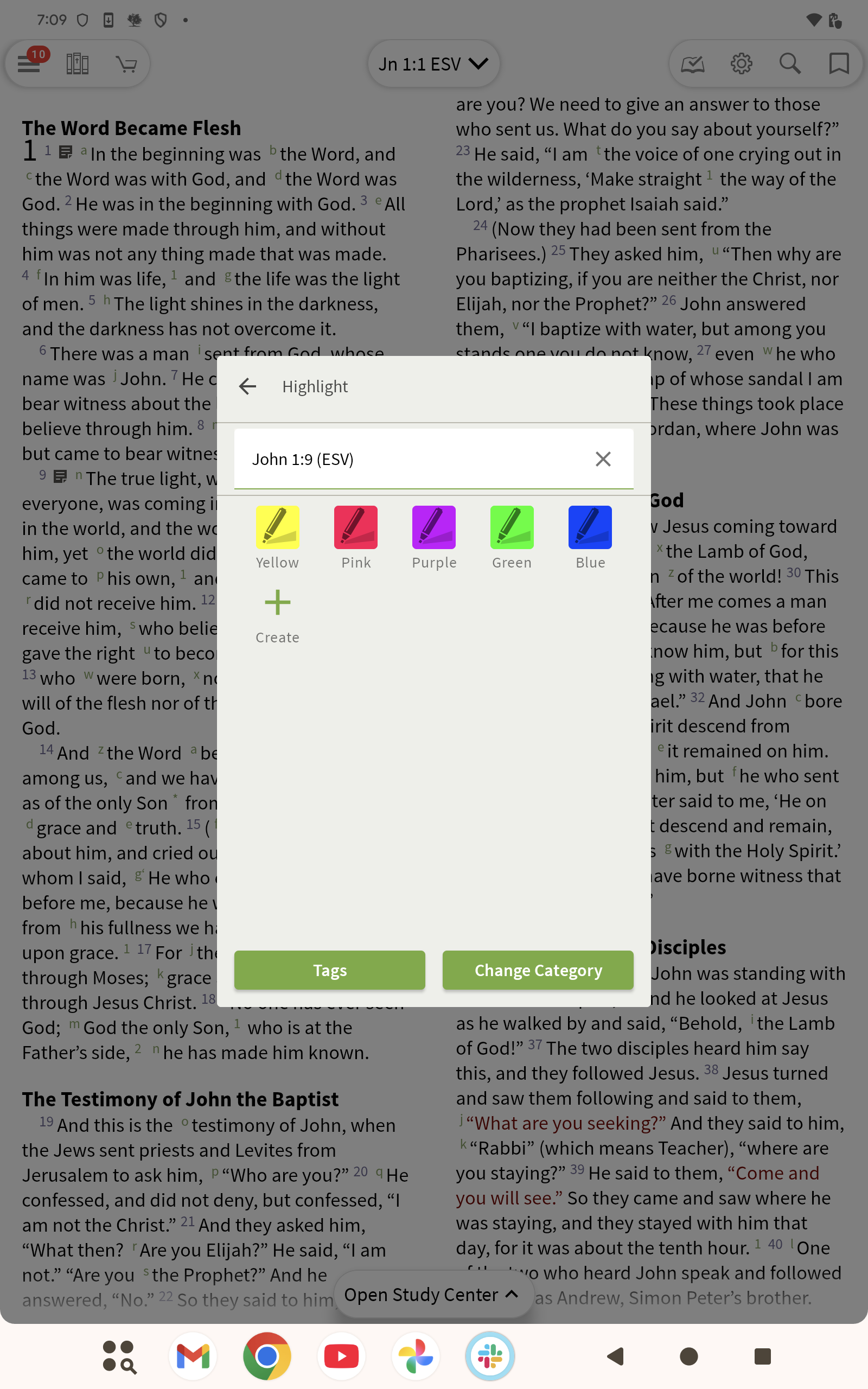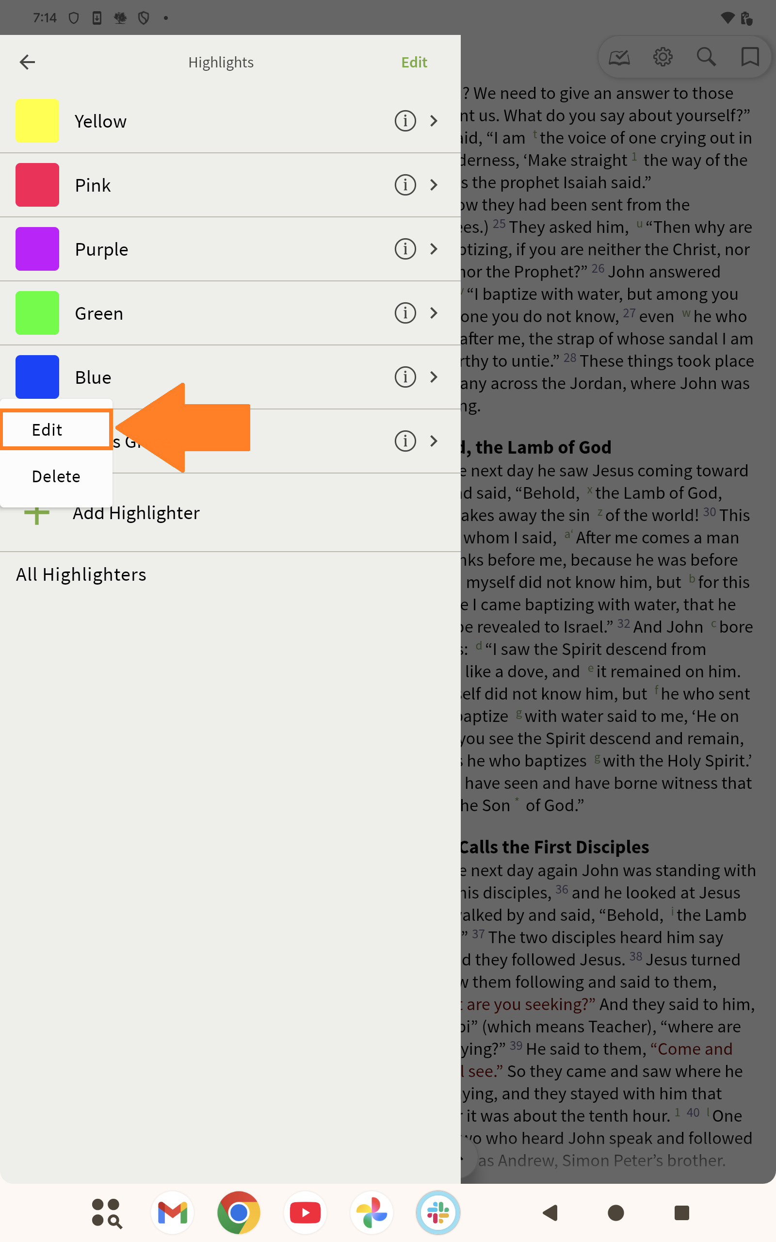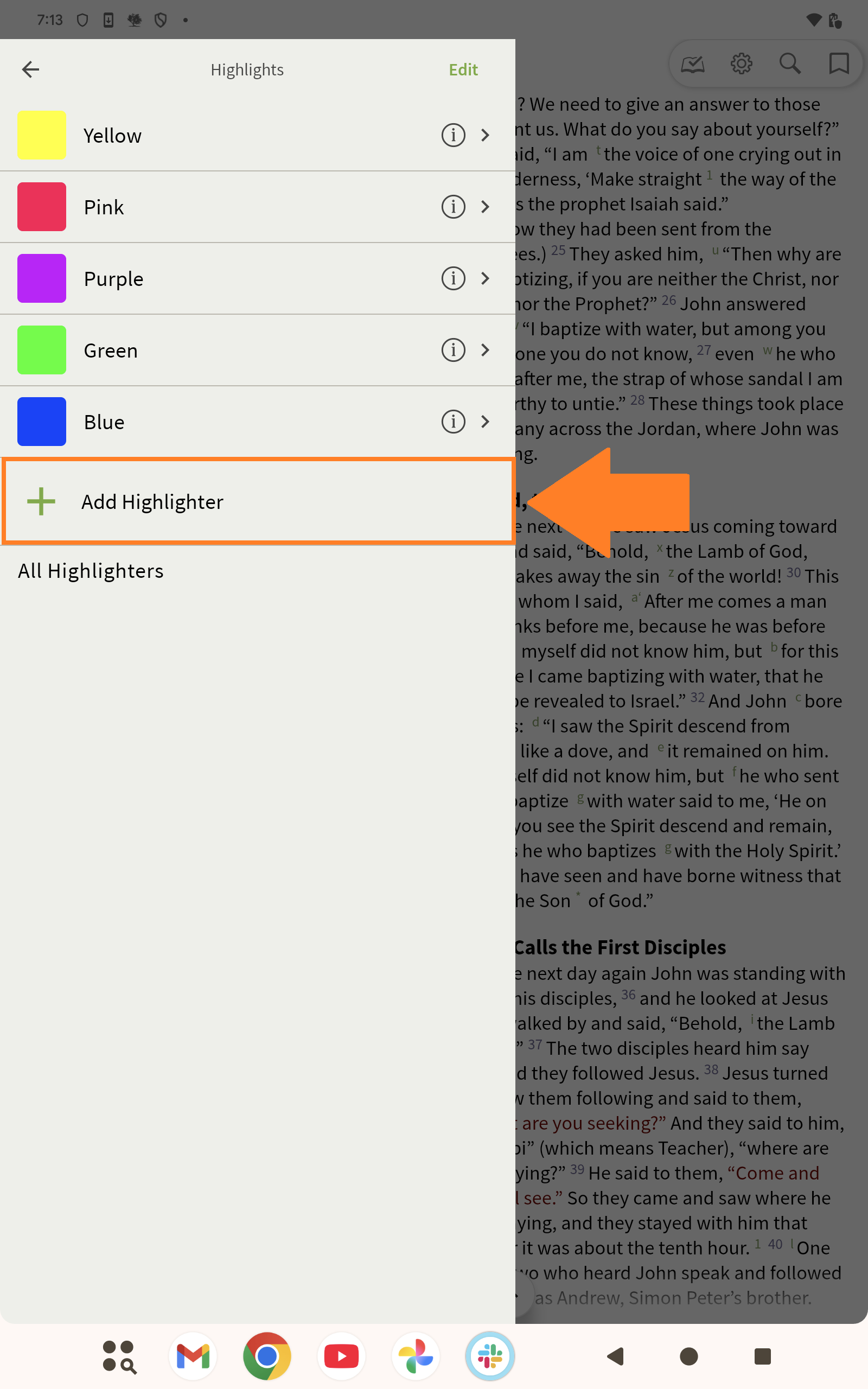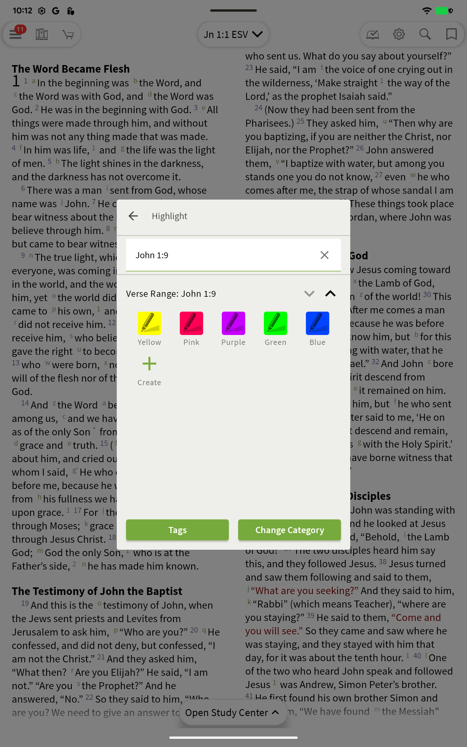 The Olive Tree Bible App provides a few different highlighters, but you can also create and customize highlighters to fit your preferences. Follow these steps to create a highlighter: