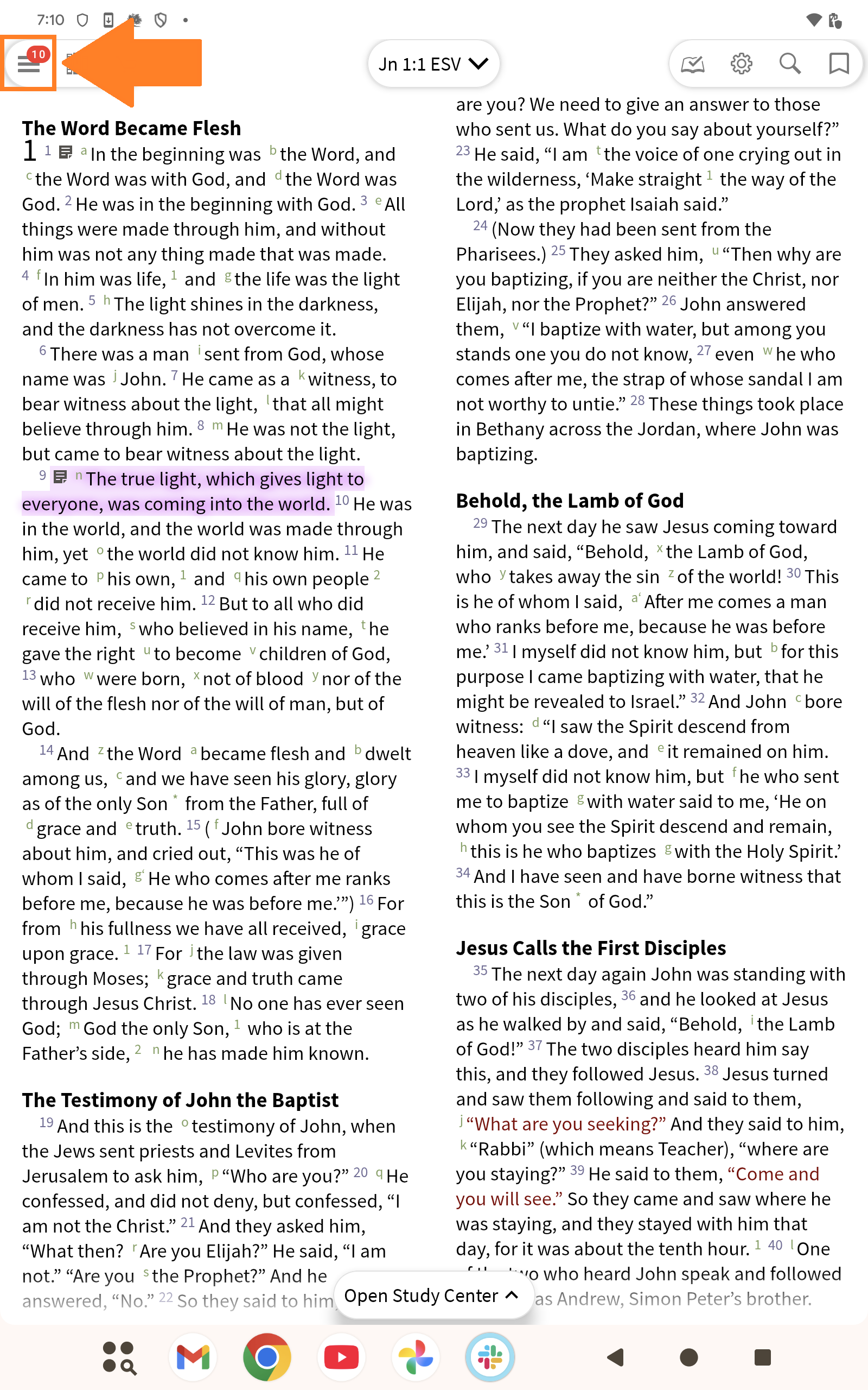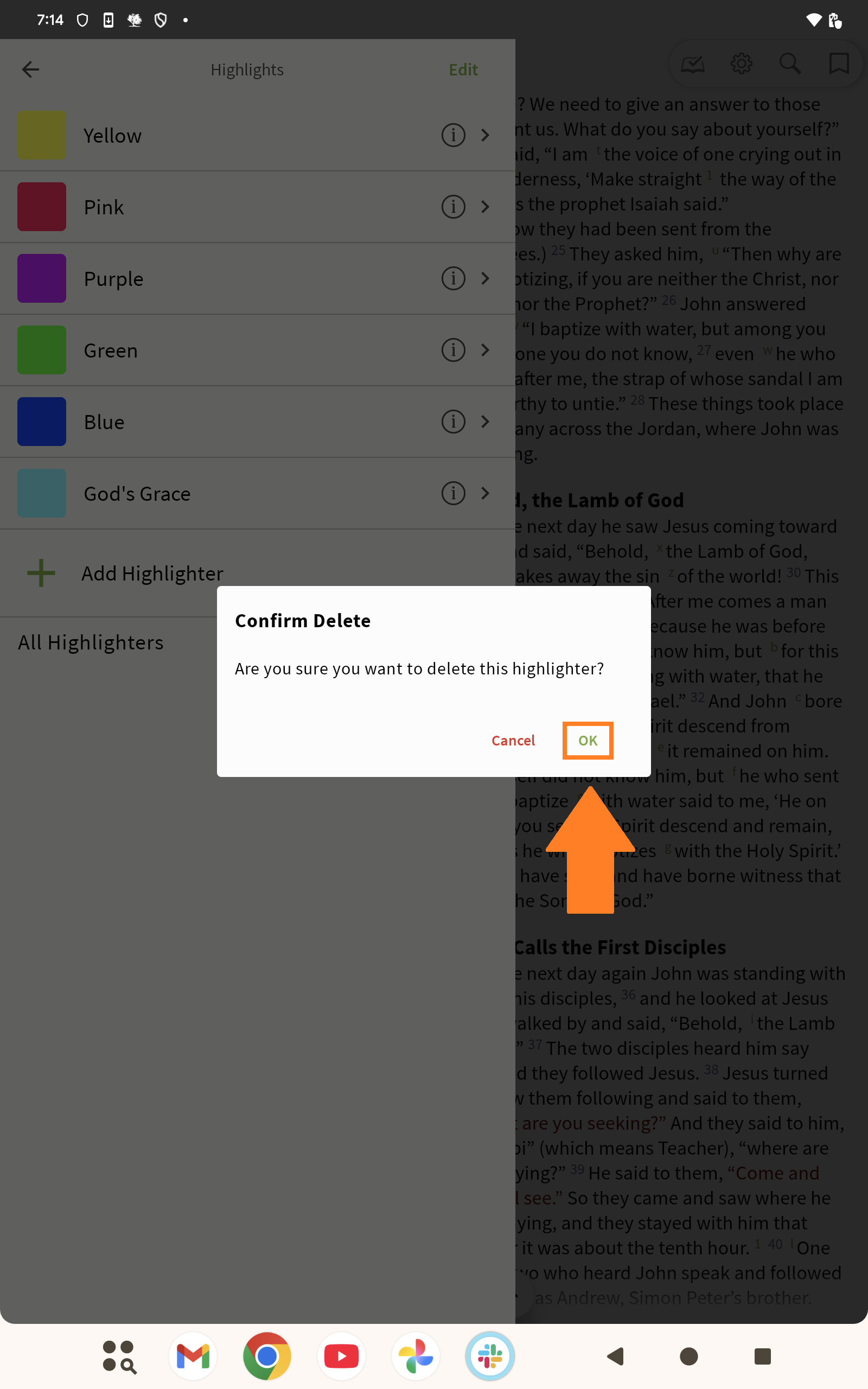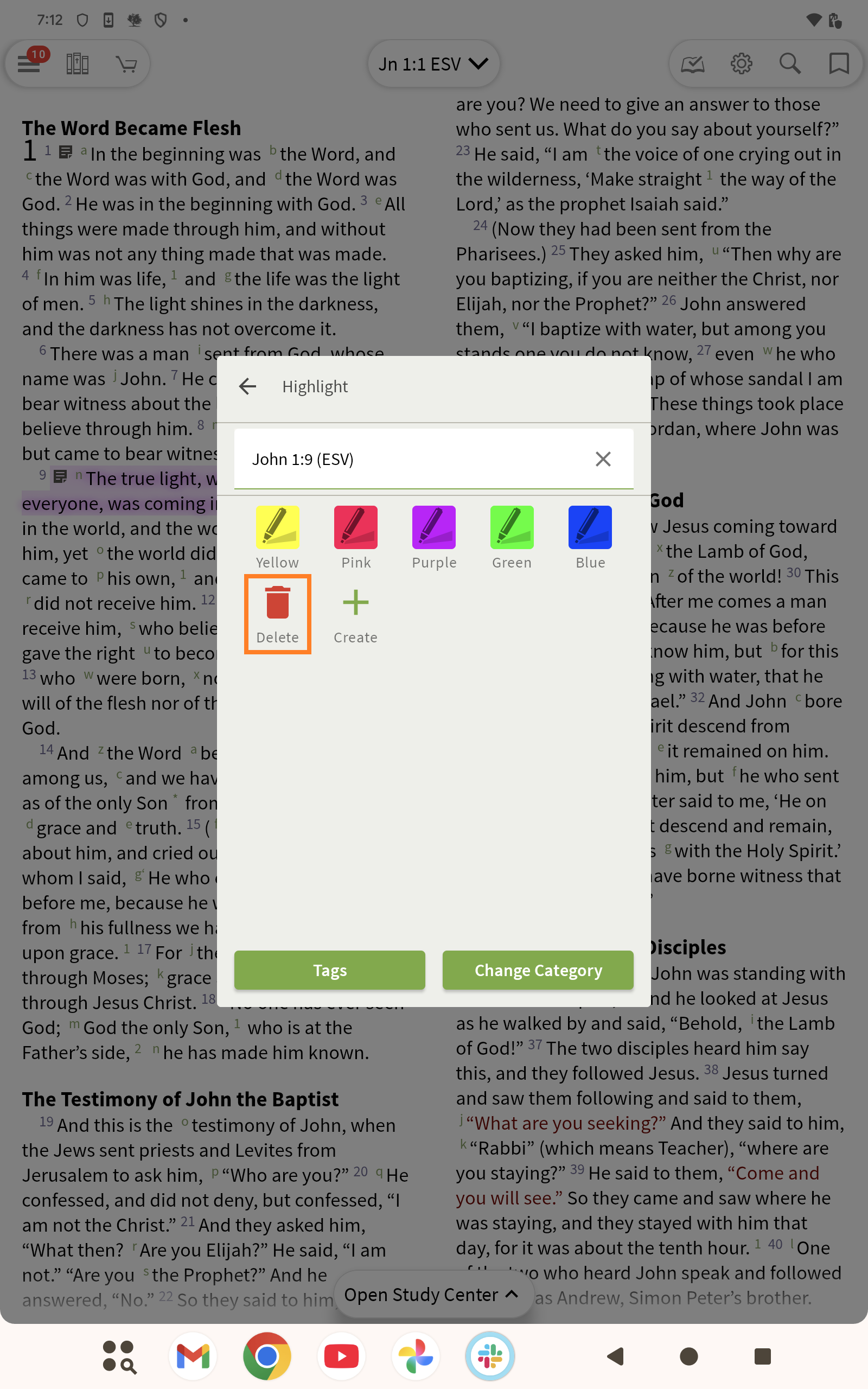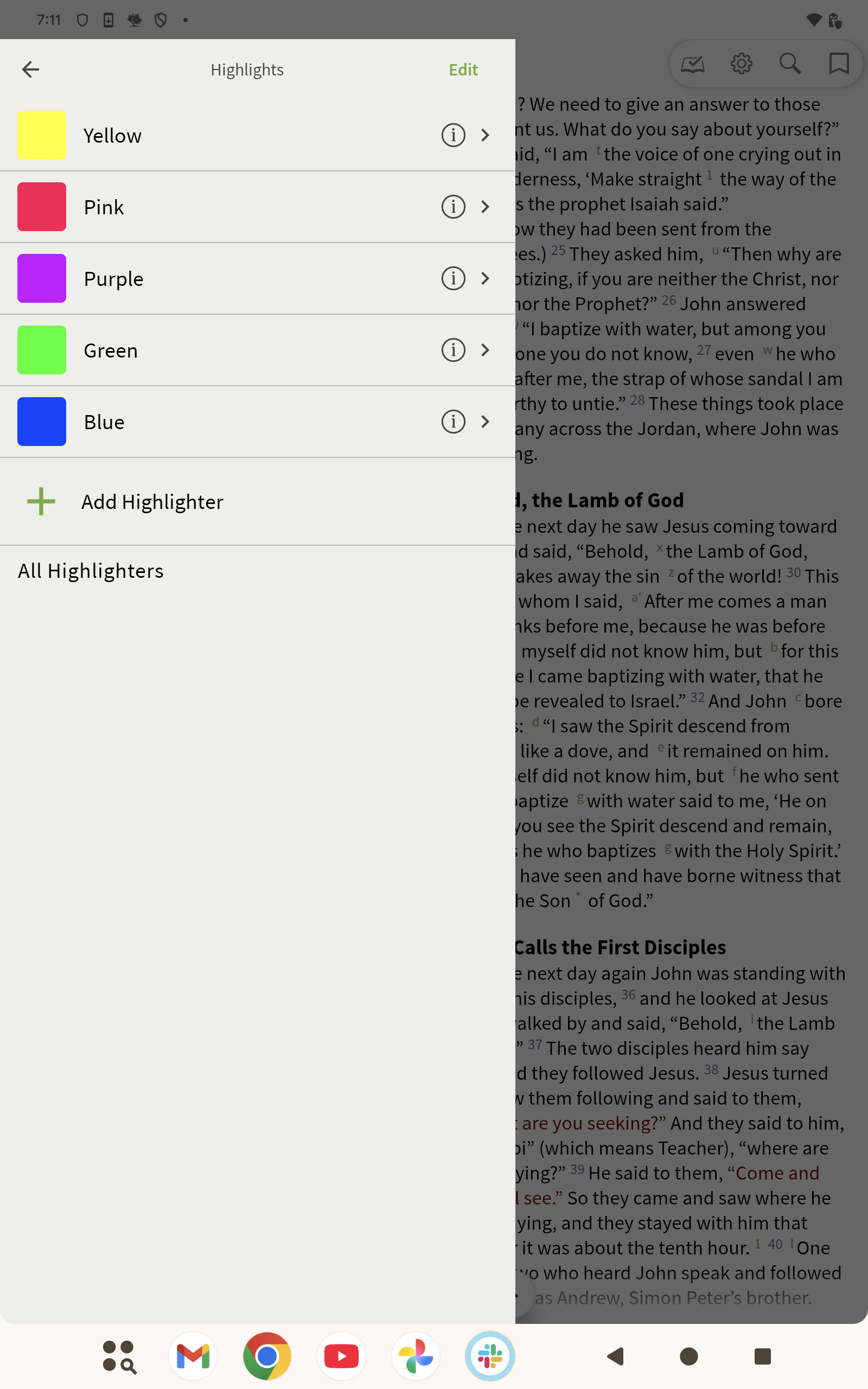 The Olive Tree Bible App provides a few different highlighters, but you can also create and customize highlighters to fit your preferences. Follow these steps to create a highlighter: