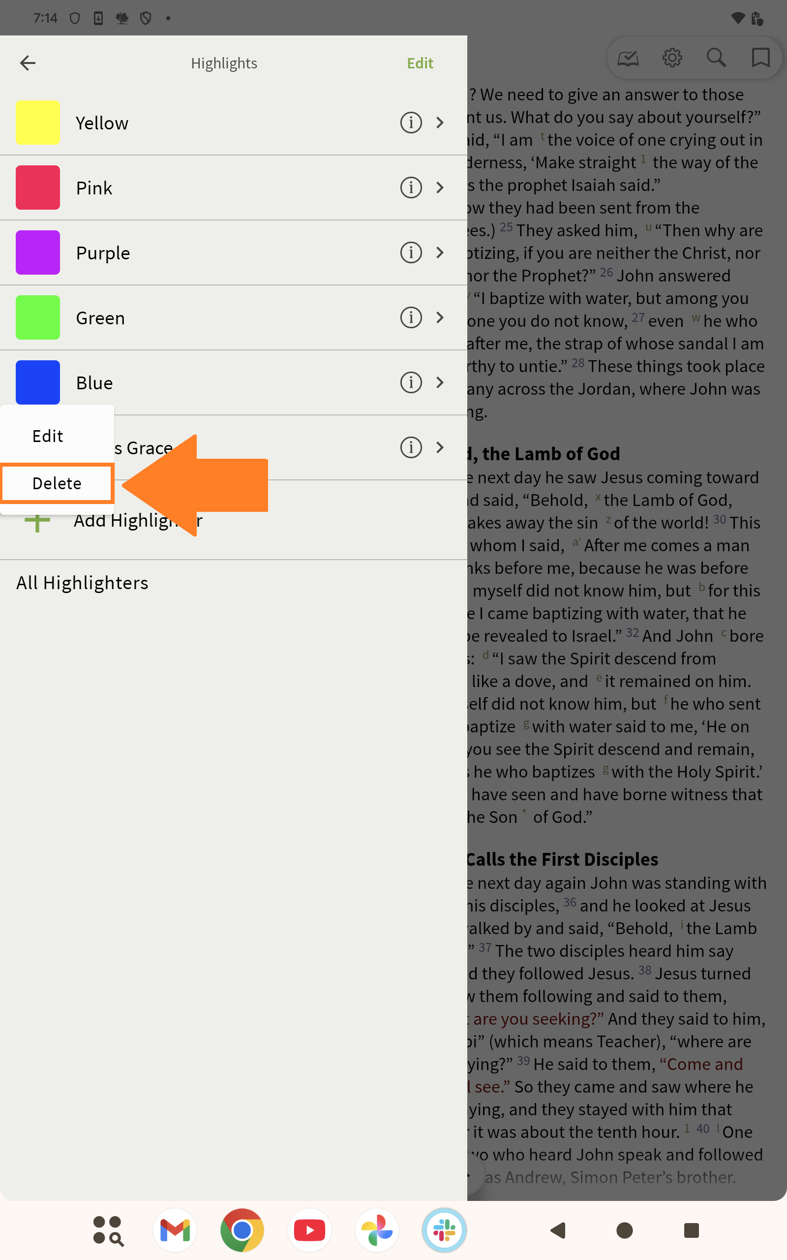 You can only delete highlighters that are not associated with highlights. If you have made highlights with the highlighter you want to delete, you will first need to edit or delete those highlights using the steps described above. Once you have done this, follow these steps to delete the highlighter: