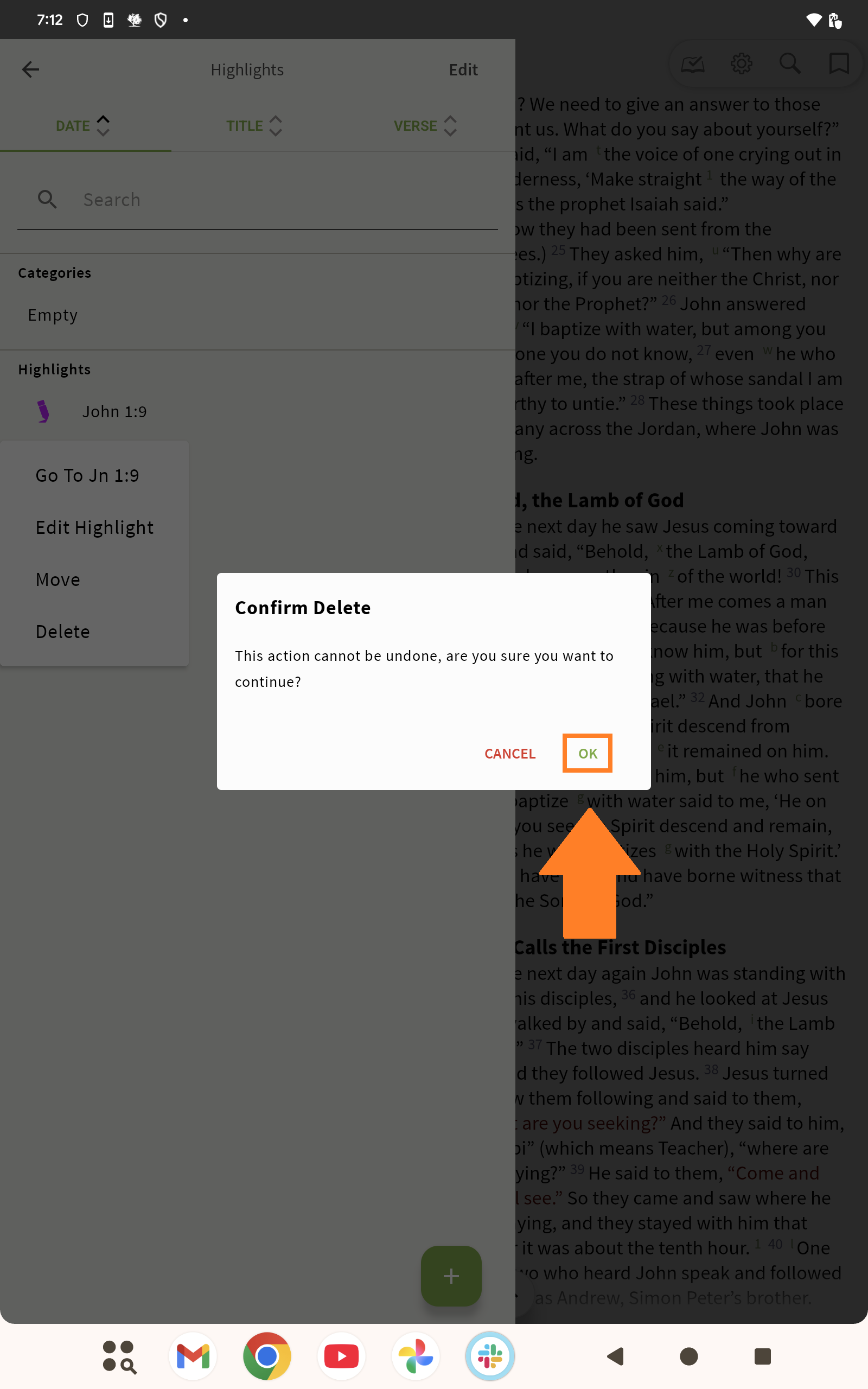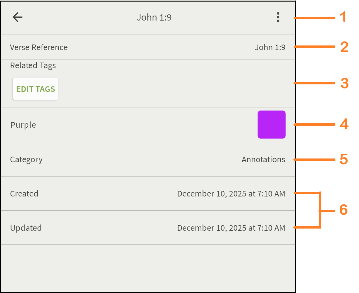 NOTE: If the text highlighted was manually selected instead of tapping the verse number, you'll see that highlighted text displayed under the verse reference.
