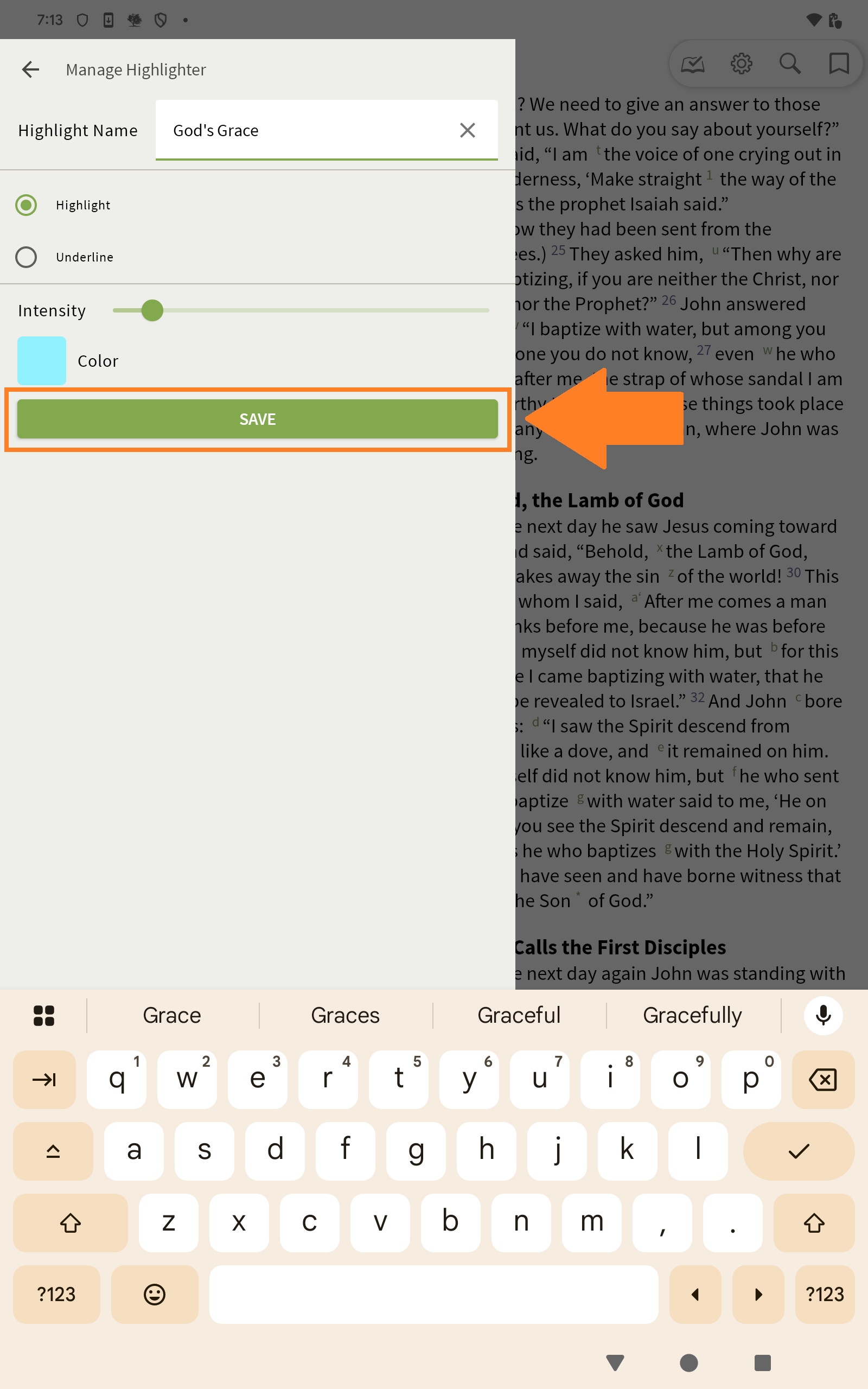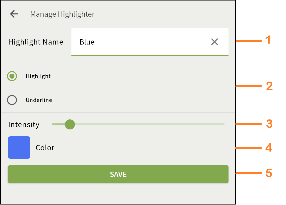- On the next screen, you can assign a highlight name (title), choose highlight or underline, change the intensity of the color, and choose the color. Tap 'Save' when you have made your selections.