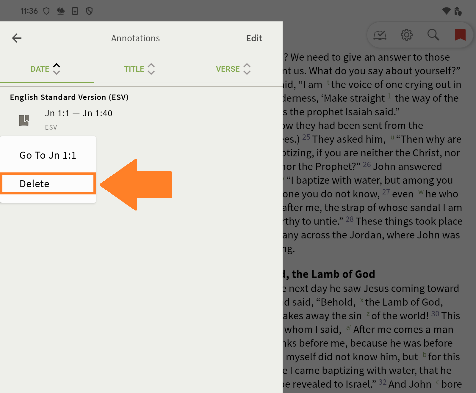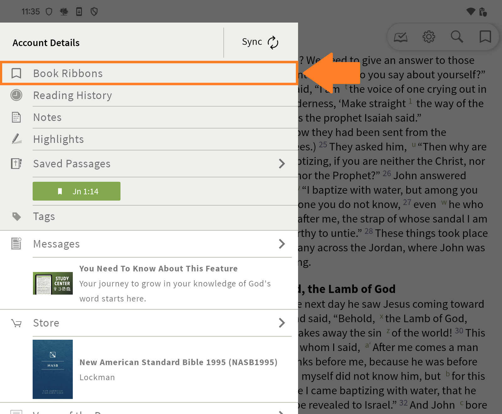 Book ribbons are a great tool for quickly marking a place in the text to return to later. Book ribbons are similar to a ribbon in a physical Bible because they mark an area of text rather than a specific Bible verse or phrase. In this way, book ribbons are different from other annotations like notes, highlights, and saved passages that can be tied to a specific Bible verse or word(s).