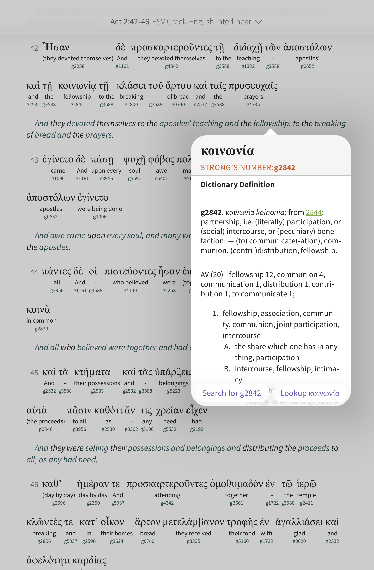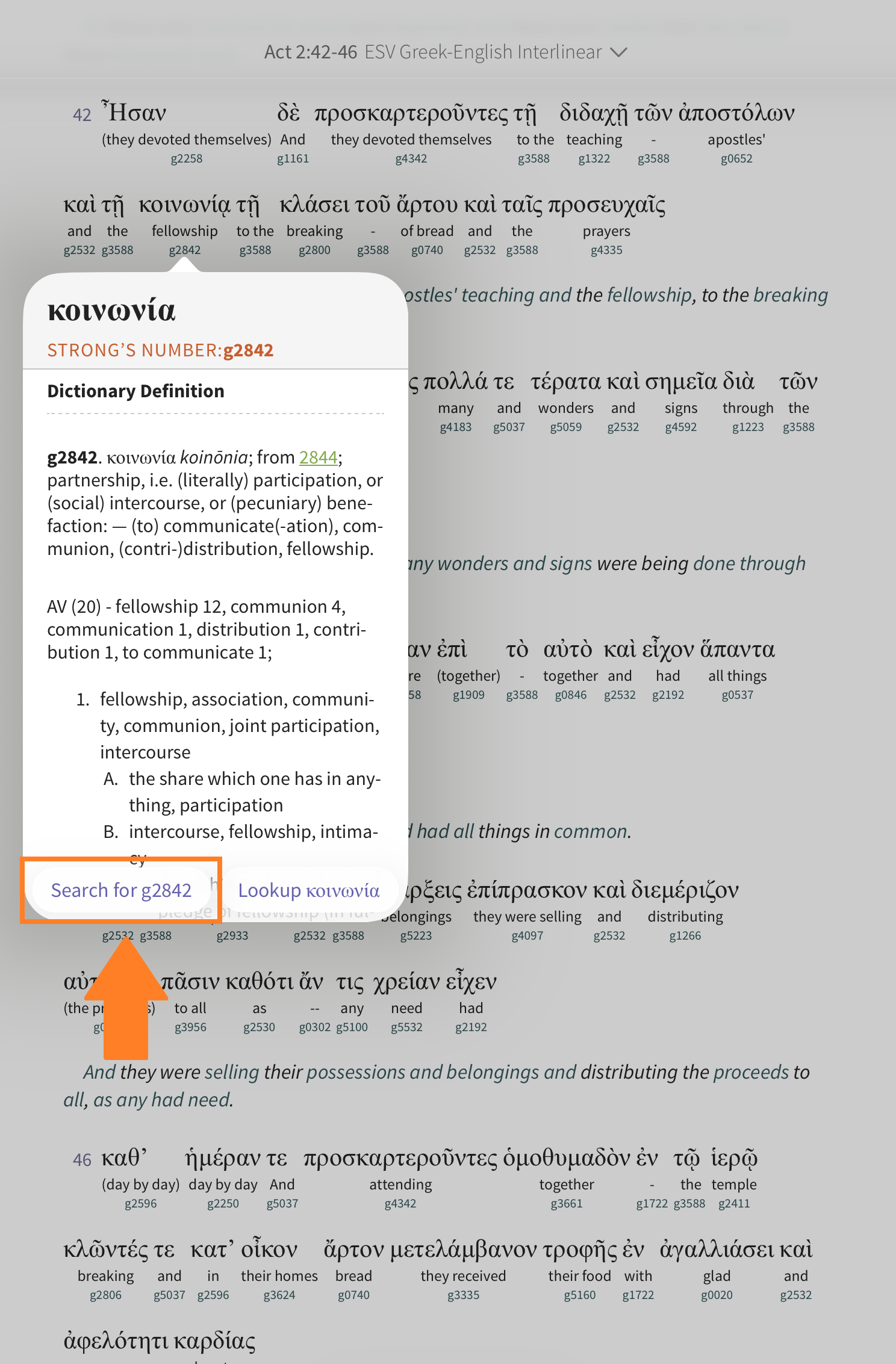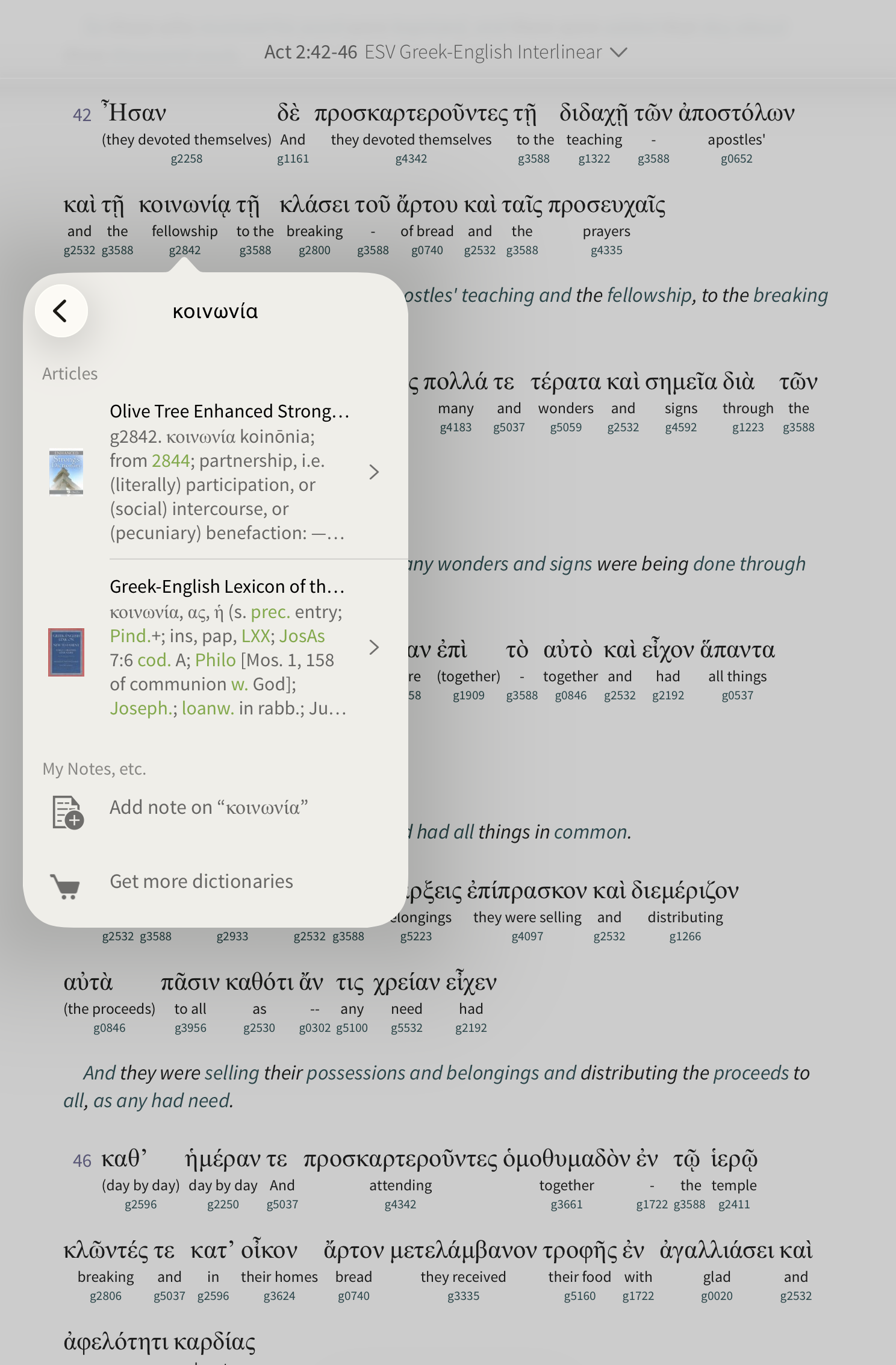 Tap a Strong’s number to open a pop-up with details on that entry: