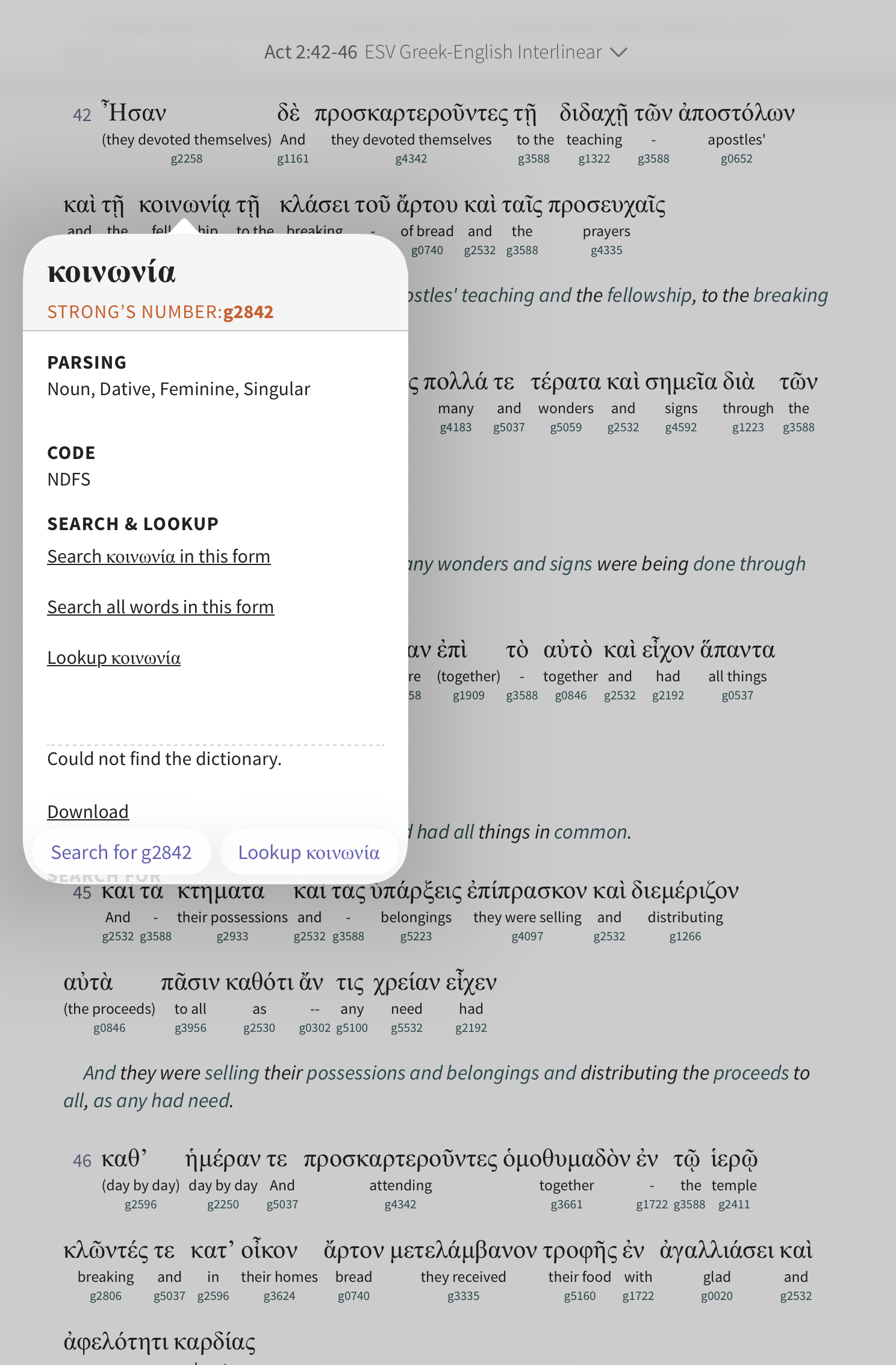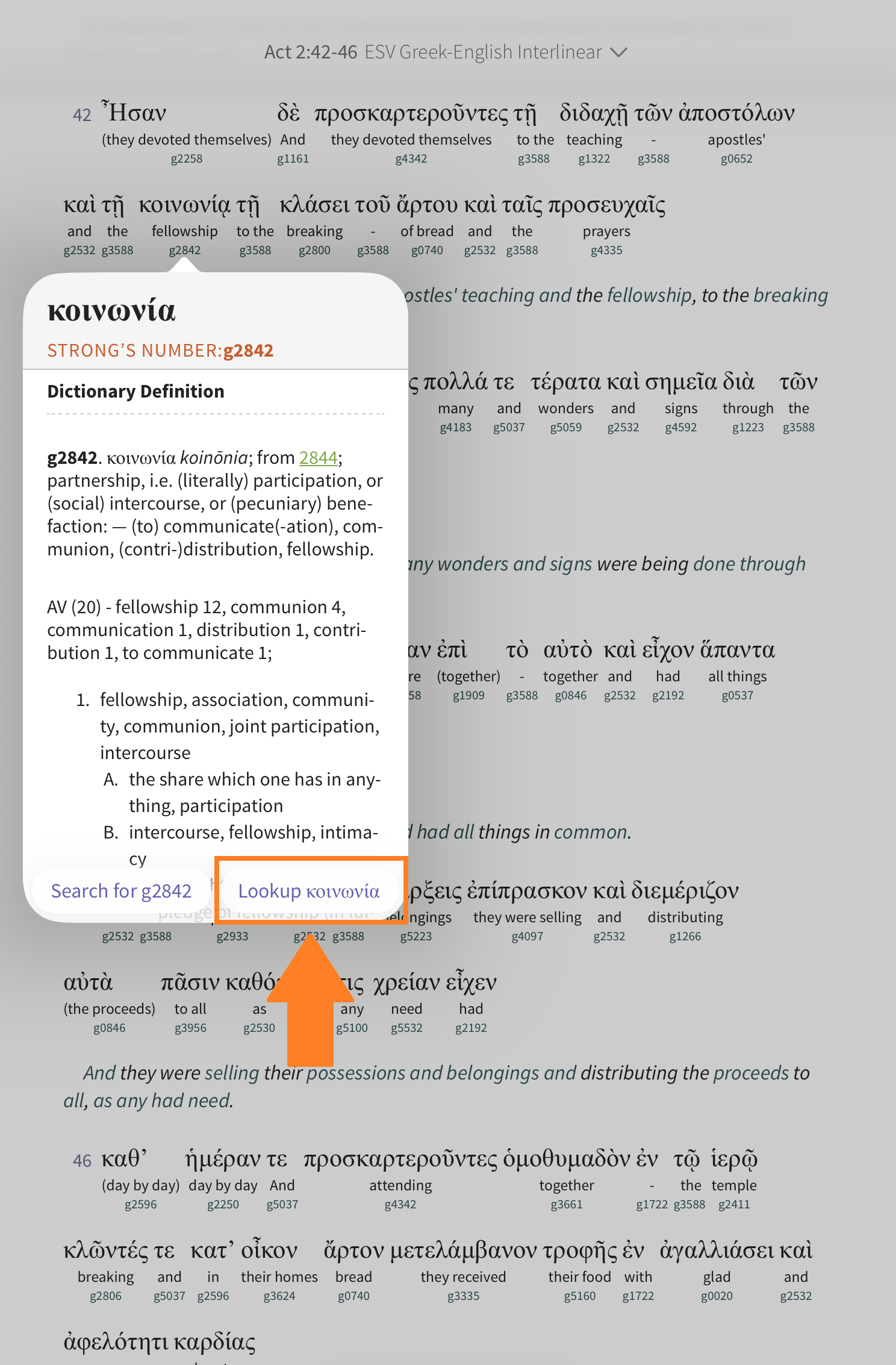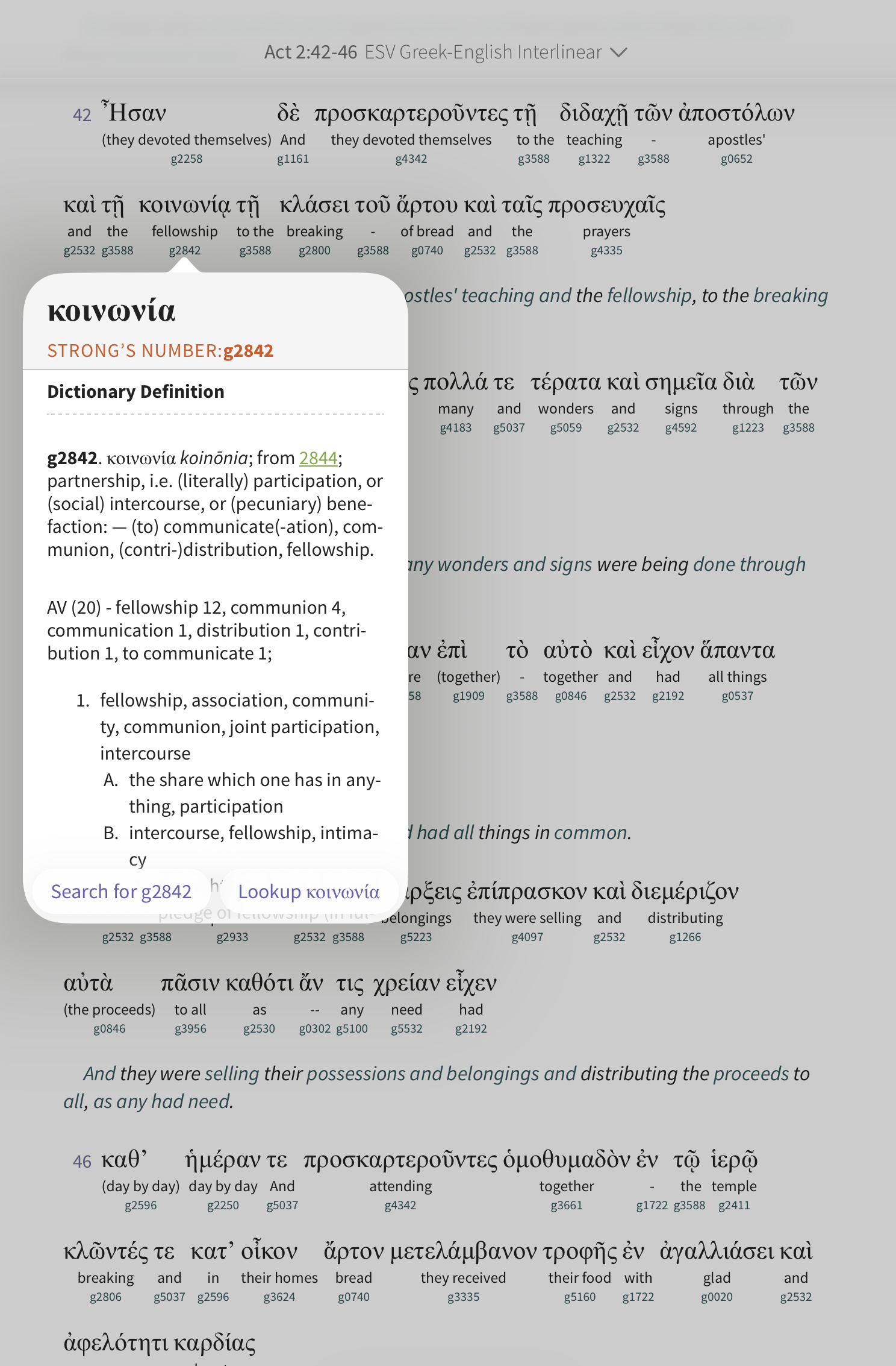 Tap a Strong’s number to open a pop-up with details on that entry:
