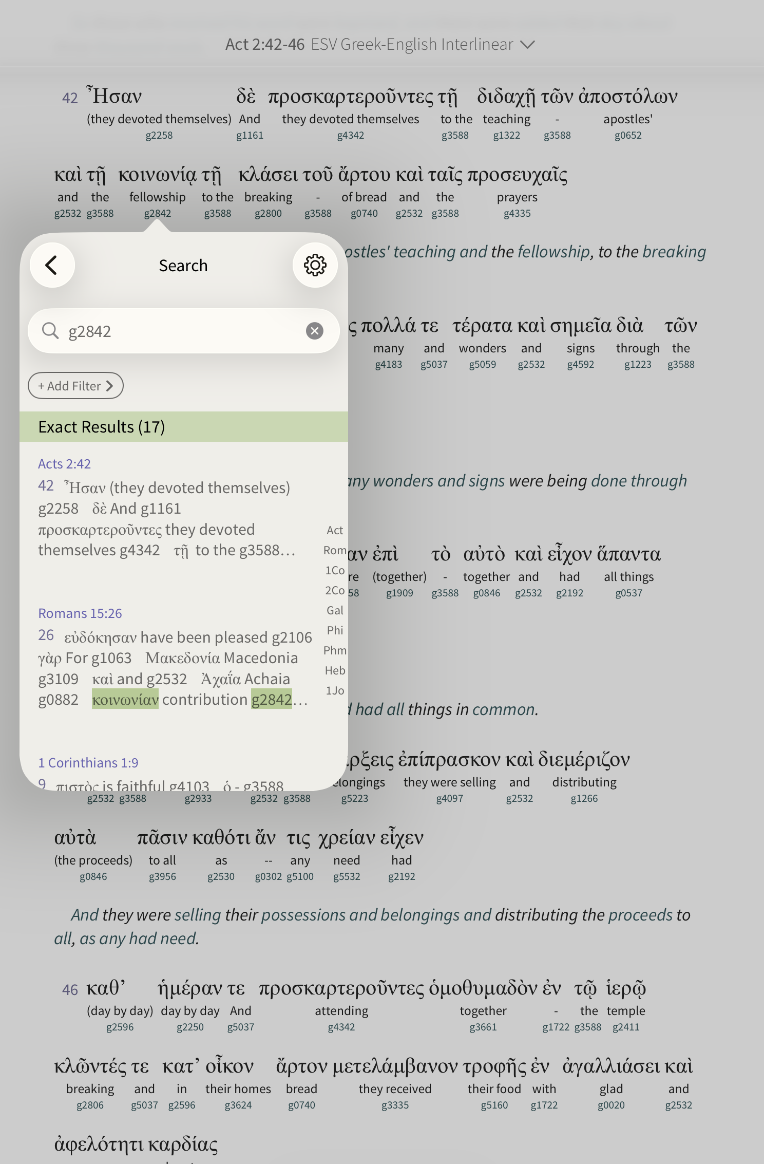 The Interlinear makes it simple to search for a Greek or Hebrew word. Tap Search at the bottom of the pop-up window, and you’ll see a list of every place that Strong’s number appears in the Bible: