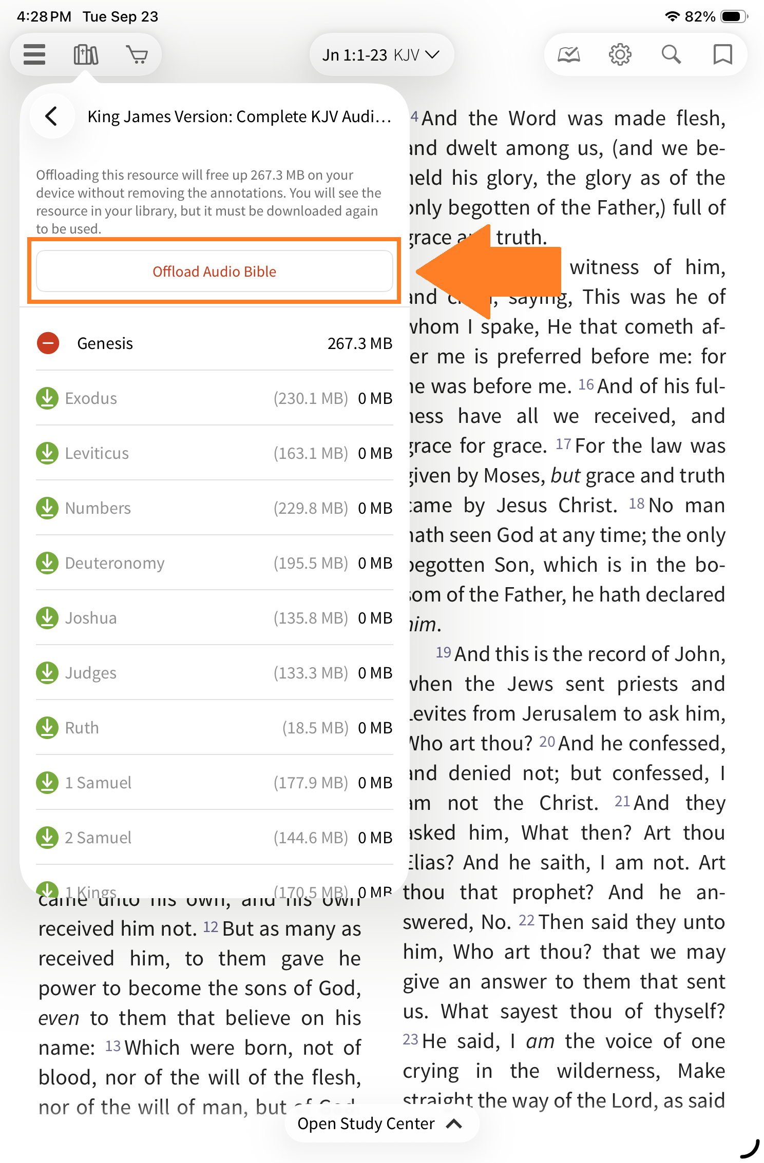 This will take you to a new window with a list of each individual Bible book in the audio resource. You can either offload the full downloaded Bible or you can offload specific Bible books.