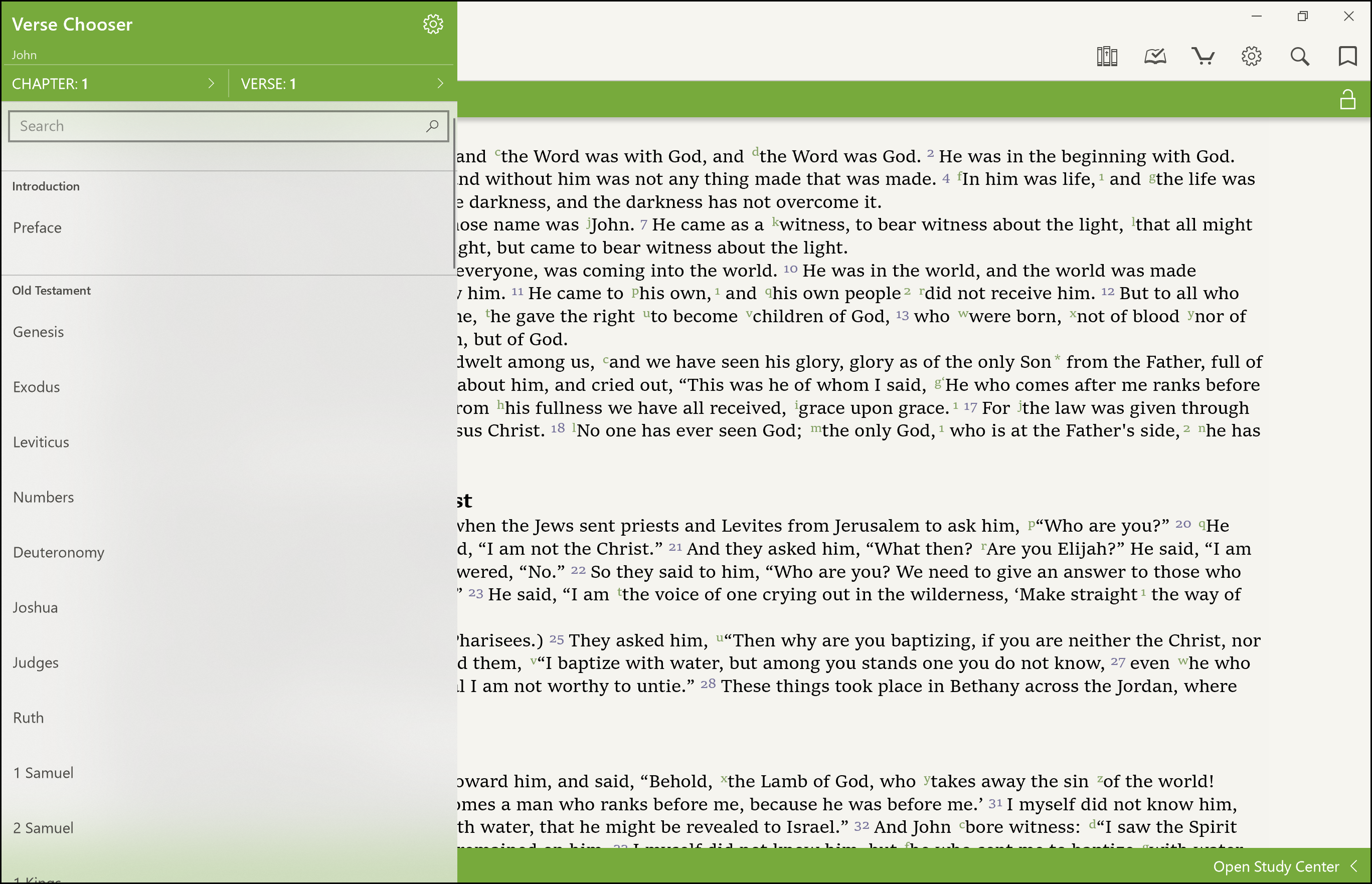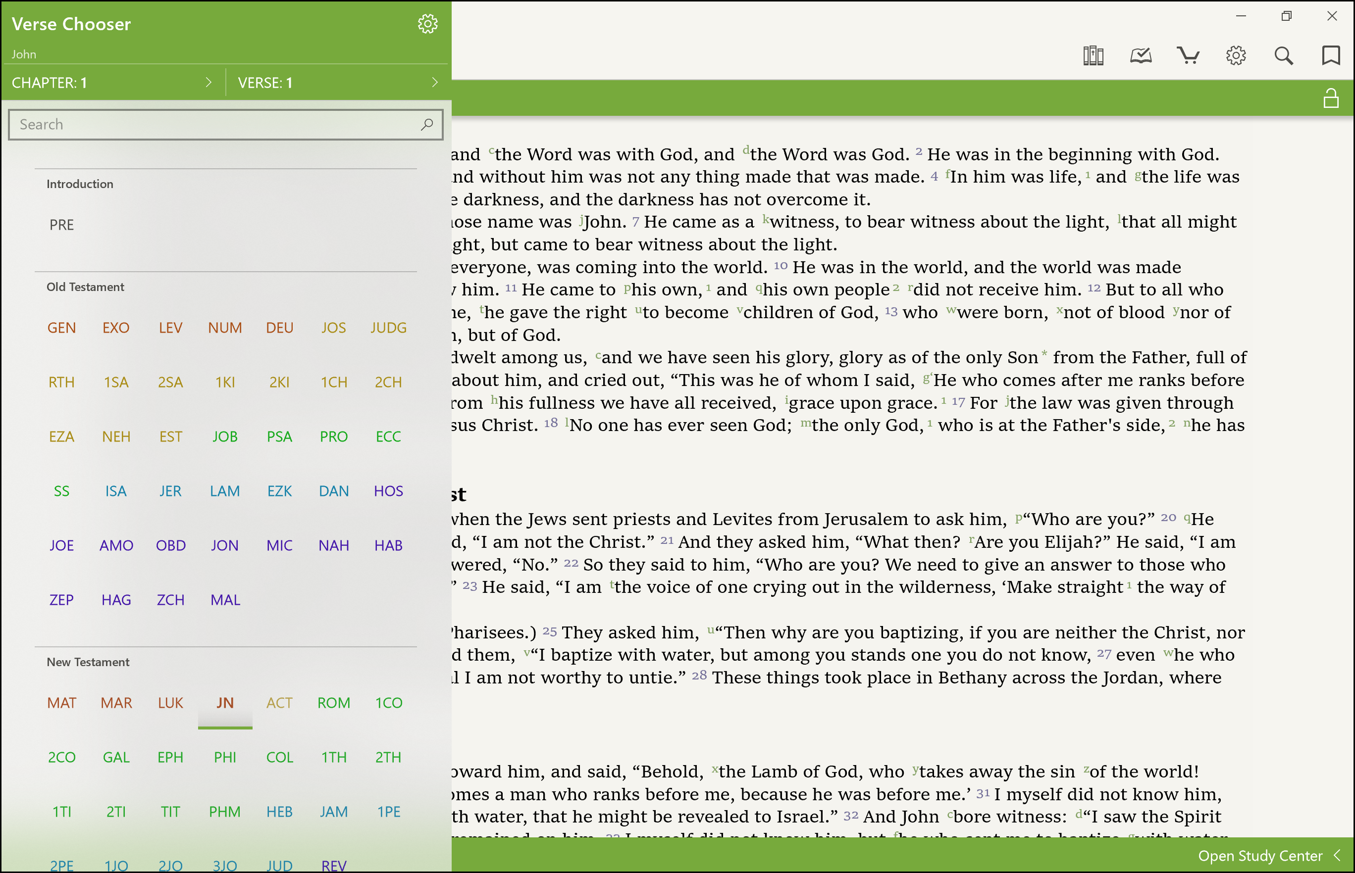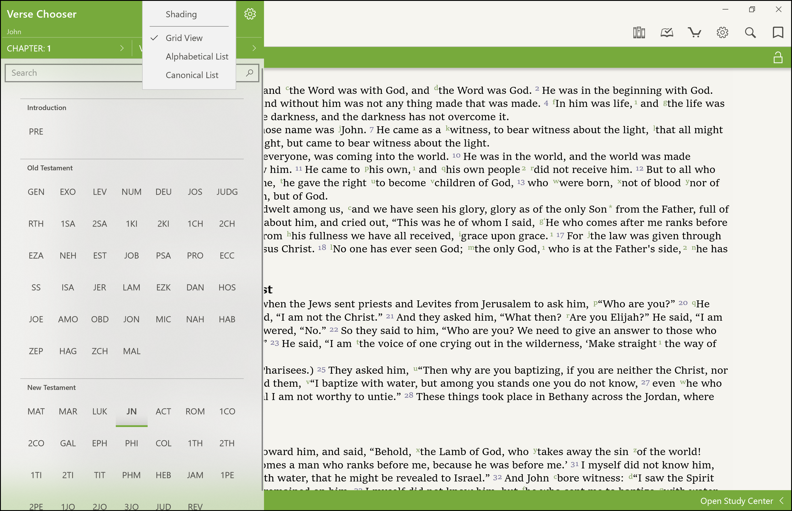 The Grid View is the default view for verse-based resources, like Bibles and commentaries. This view makes it easy to select a book, chapter and verse.