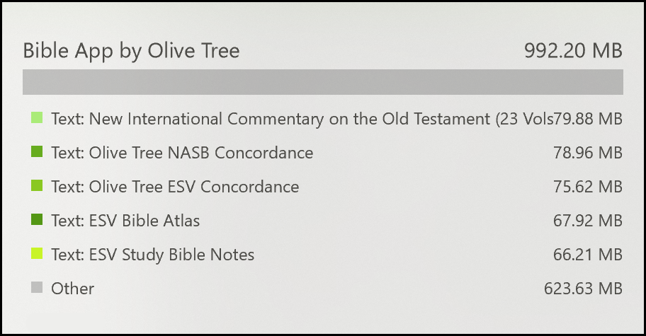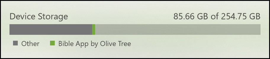 The first graph shows the storage on your device. You can see how much space the Bible App uses, as well as how much is used by other apps on your device.