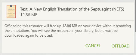 Selecting a book will allow you to offload (remove) the resource from your device. Selecting an audio Bible allows you to offload the full Bible or choose which books of the Bible to keep on your device.
