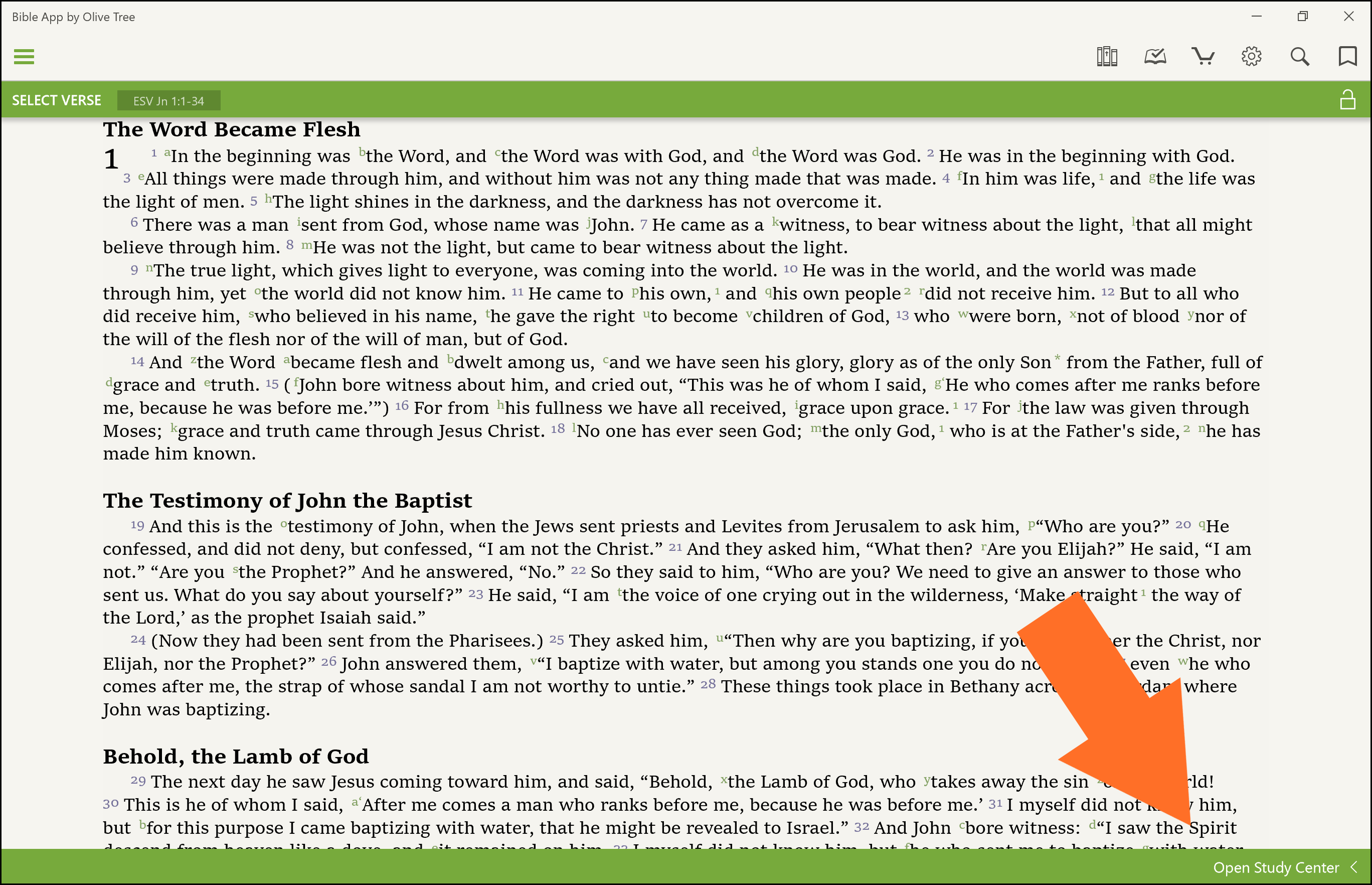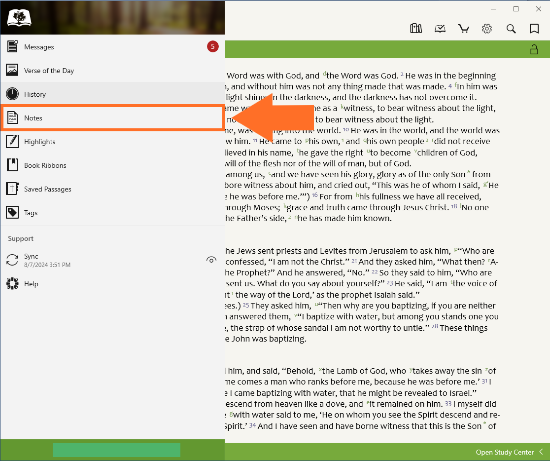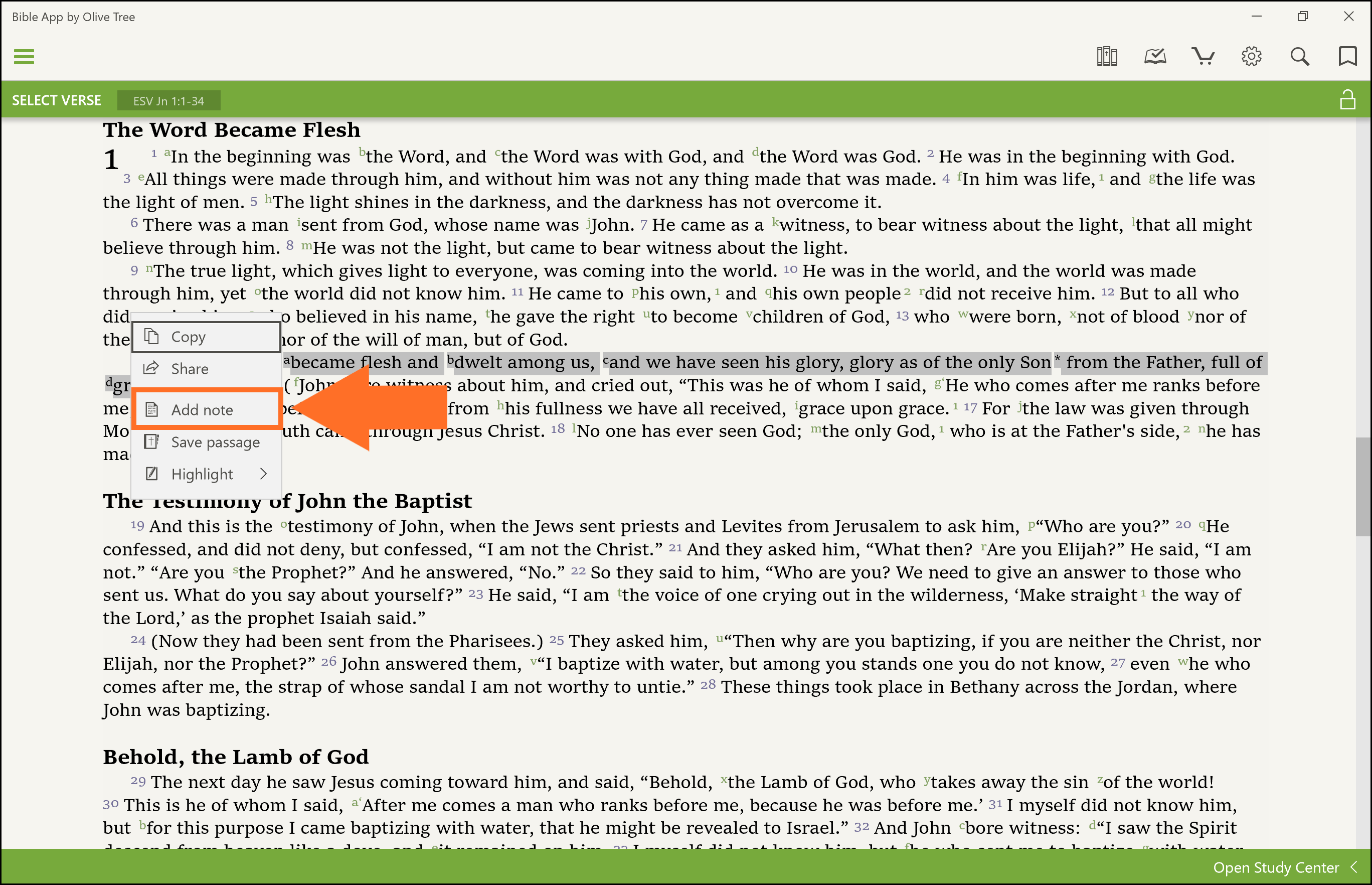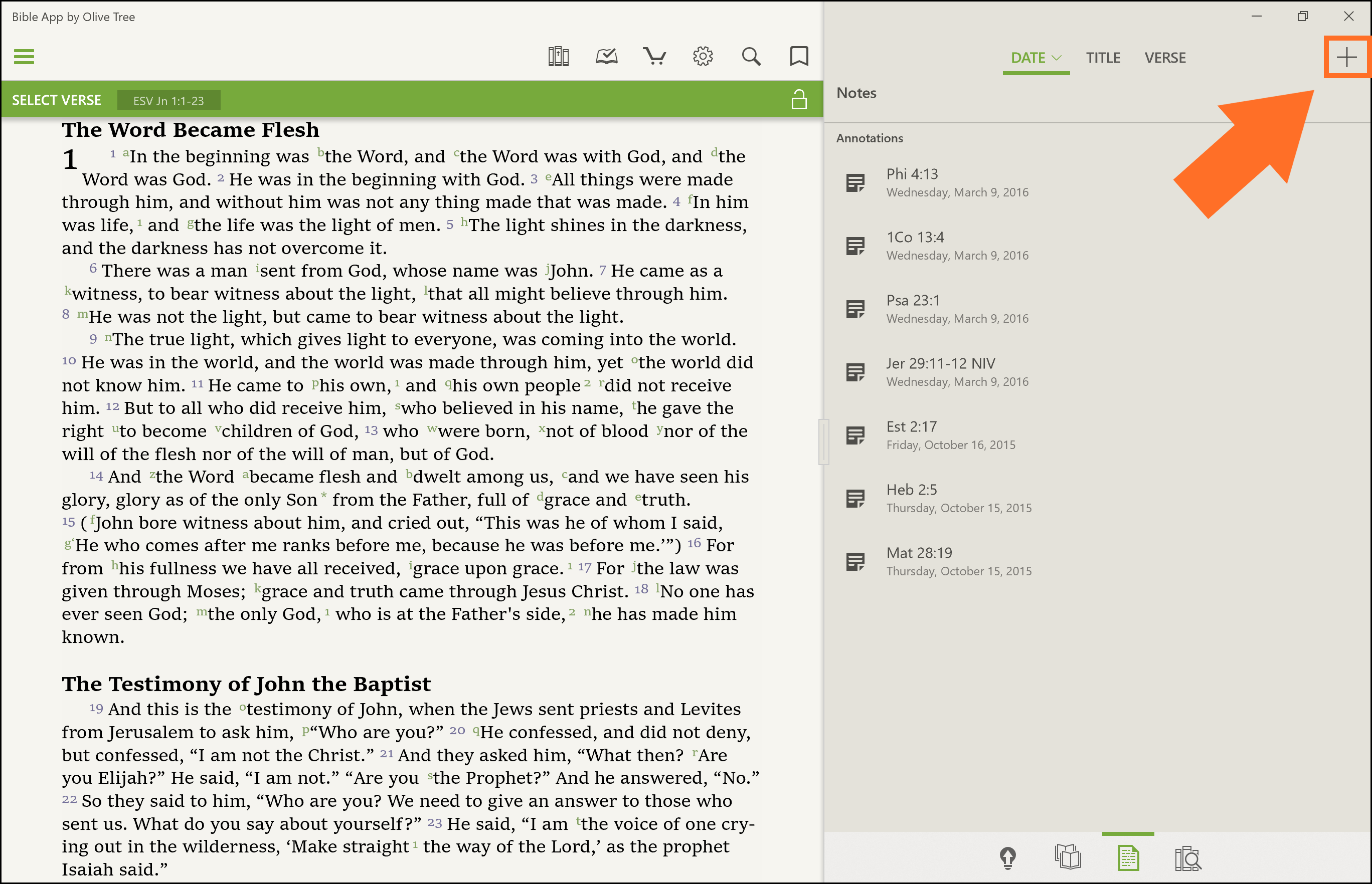 The most common way to create a note is while viewing text. As mentioned above, these notes can be tied either to a verse or to text. Follow these steps to create a note: