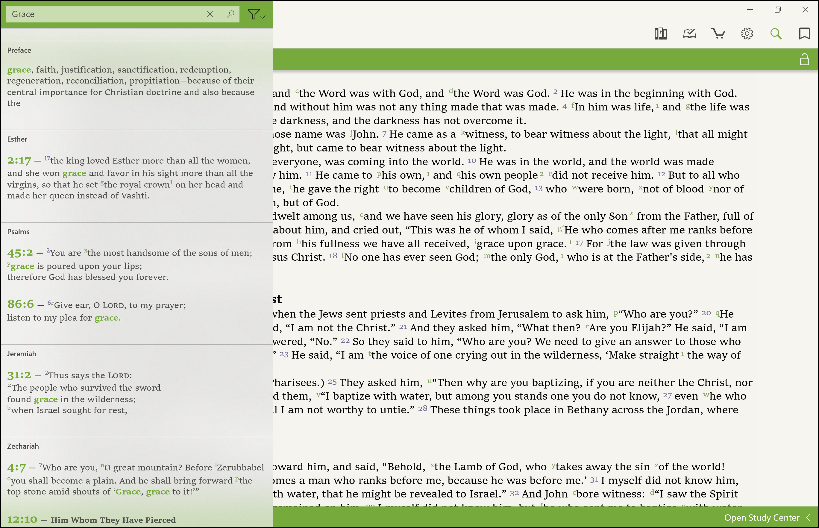 In the search box at the top of the screen, type in a verse, word, or phrase. Here is an example of some results a word search brings up in the Study Center:
