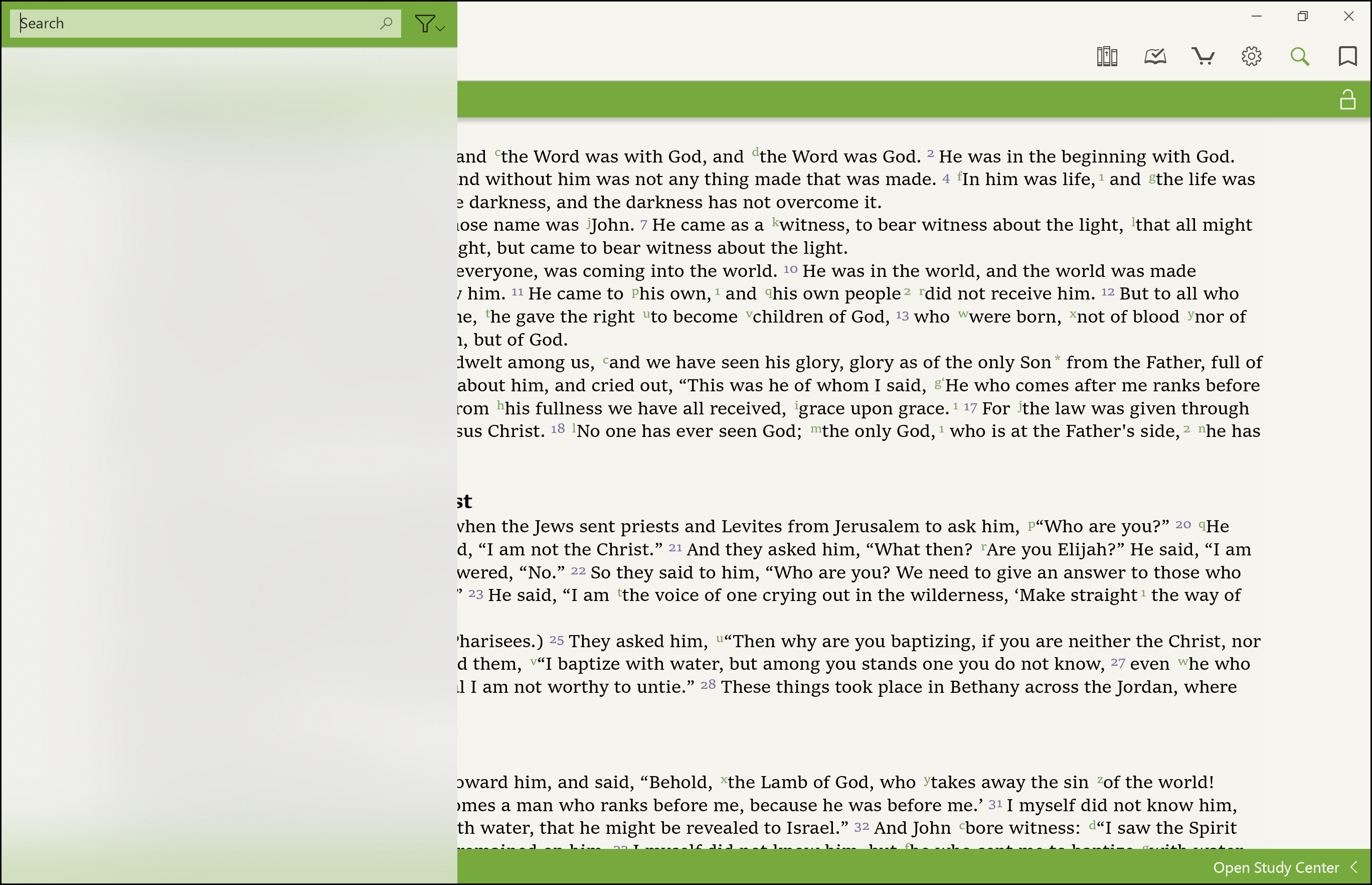 When the Study Center is open, click on the search icon in the lower right corner. It looks like this: