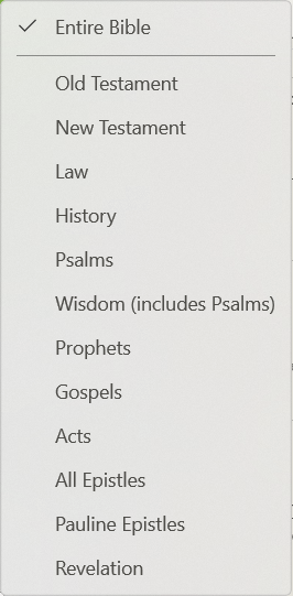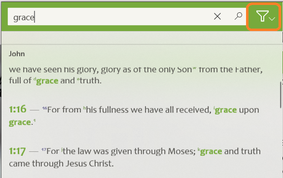 You will notice there is also a filter for this search option. Click the filter icon and click on an option in the list to add a filter to your search. Click the filter icon and click 'Entire Bible' to clear the filter.