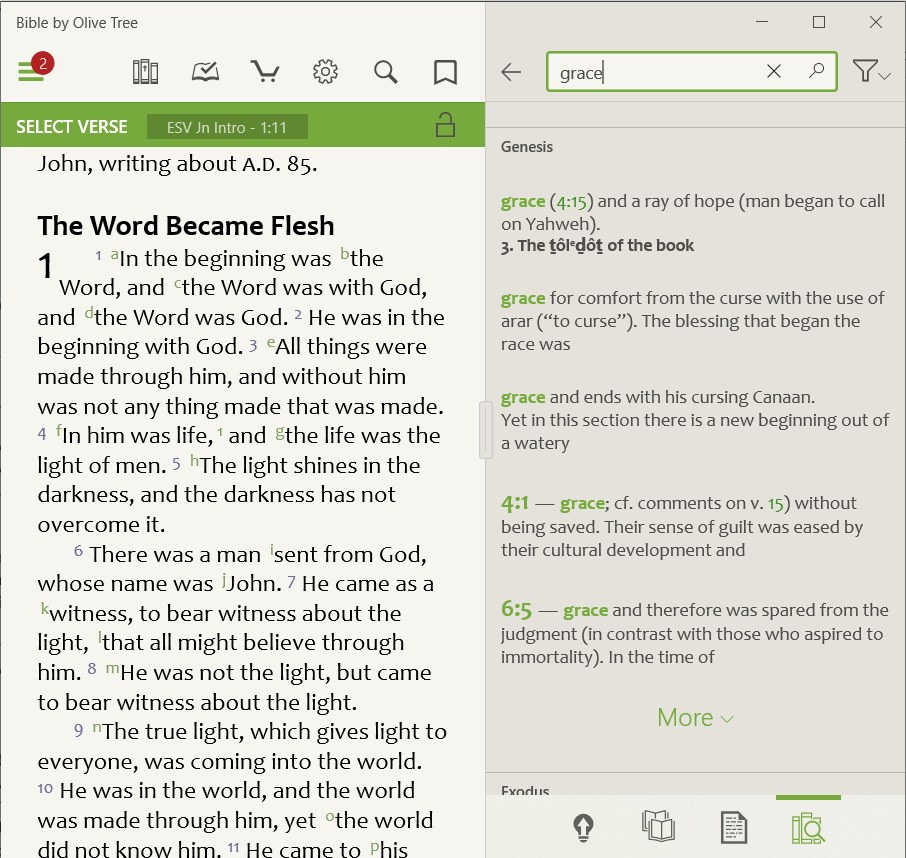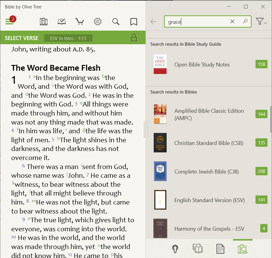 Search is a feature in the Olive Tree Bible App that will help you find a Bible verse or a word in a book you have downloaded to your Library. There are two ways to search in the Windows app.