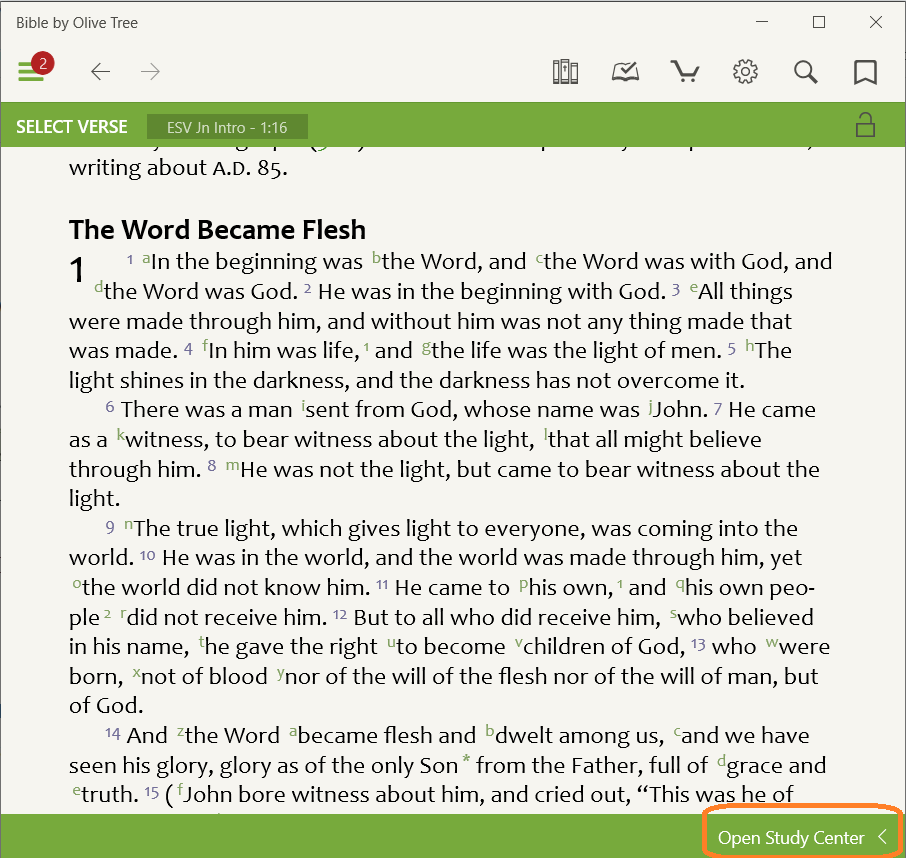 To start, click on the green bar that says 'Open Study Center' at the bottom of the screen. If the green bar is not visible, click anywhere on the screen to bring it up.