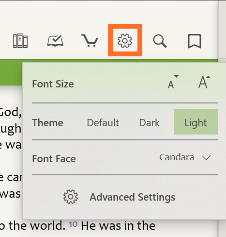 Settings for the app can be found by selecting the Settings icon on the toolbar.
