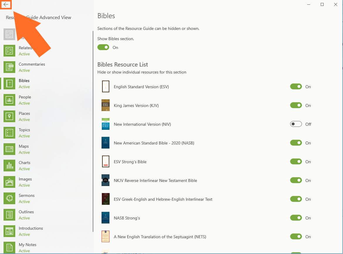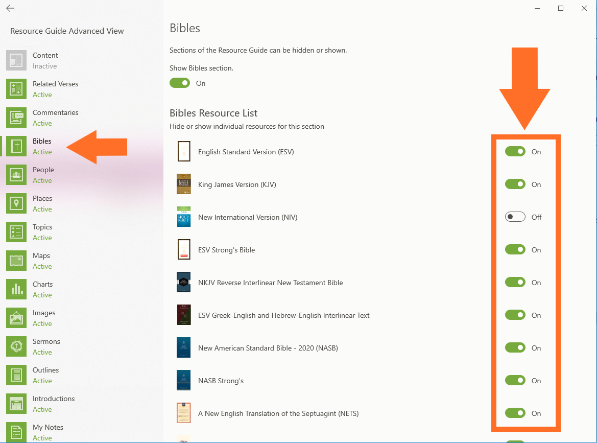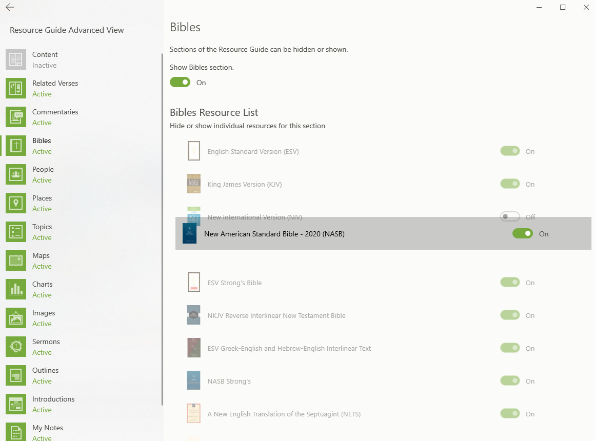 Once you click on Advanced View, you will see an icon for each section of the Resource Guide to the left side. Click on an icon here. When the page for that section opens, you will see another place to enable or disable the section using the toggle. You will also see a way to enable and disable each downloaded resource by using the toggle to the right of each resource. This enables you to control the content you see in each section of the Resource Guide.