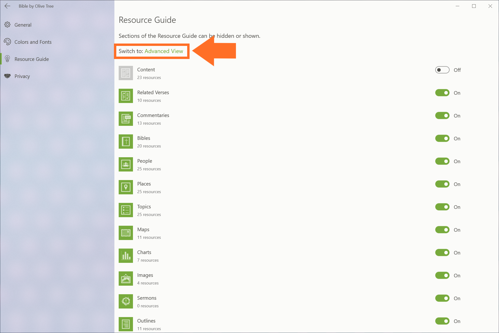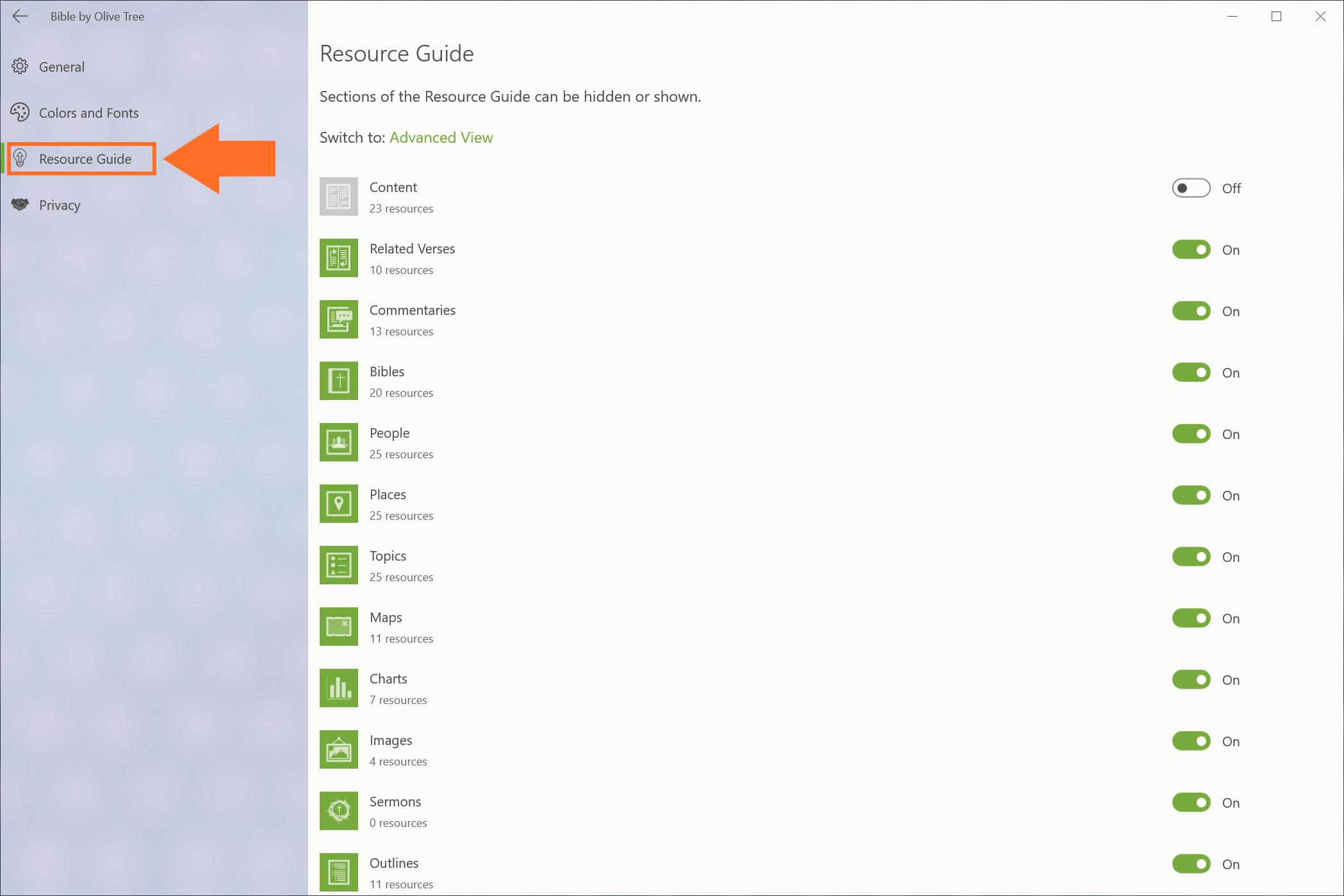 You can also switch to the Advanced View to customize the Resource Guide even further.