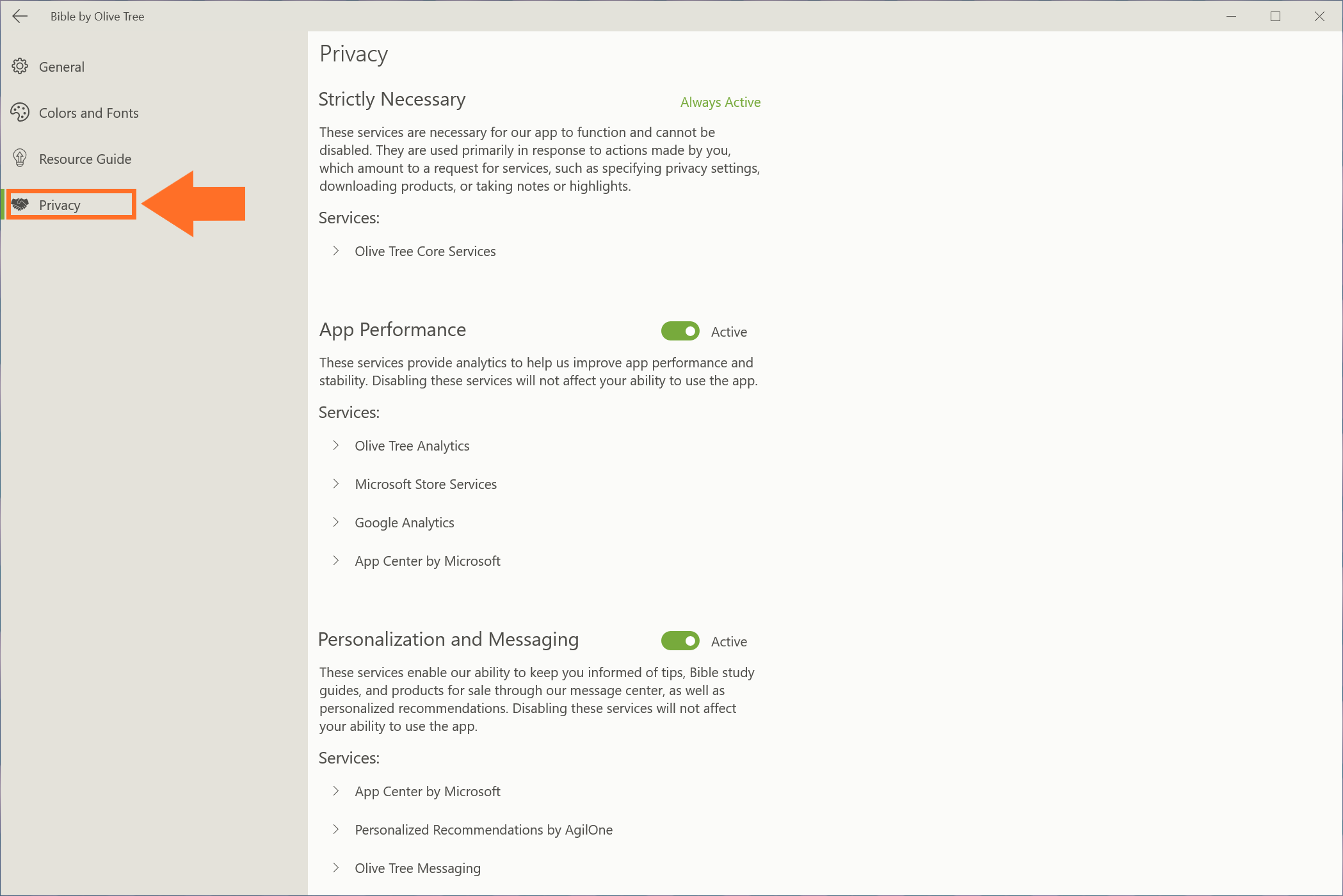 Click on each of the 'Services' listed to see a description of what each one does. Use the toggle to turn App Performance or Personalization and Messaging to 'Active' or 'Inactive' depending on your preference.
