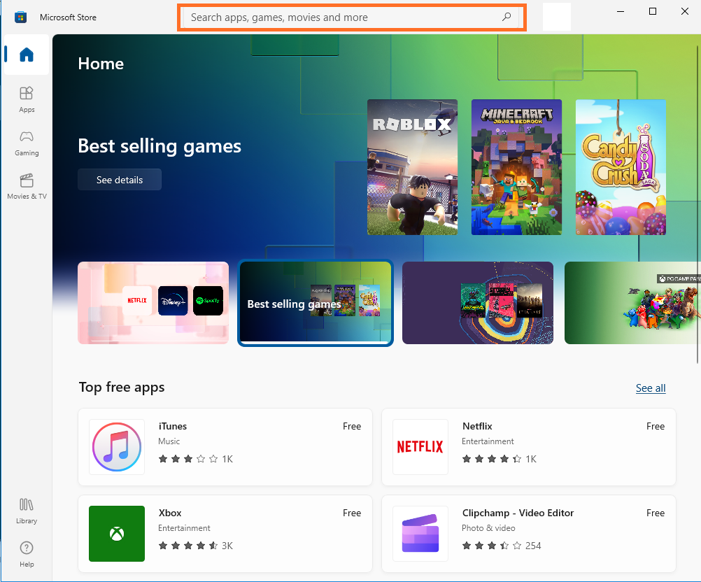 Alternatively, you can click in the Search bar, type in 'Microsoft Store', and click on the option that appears.