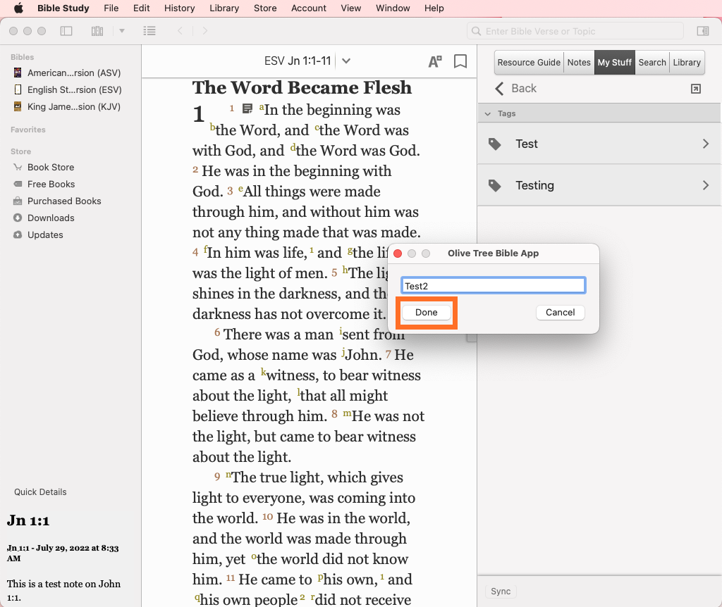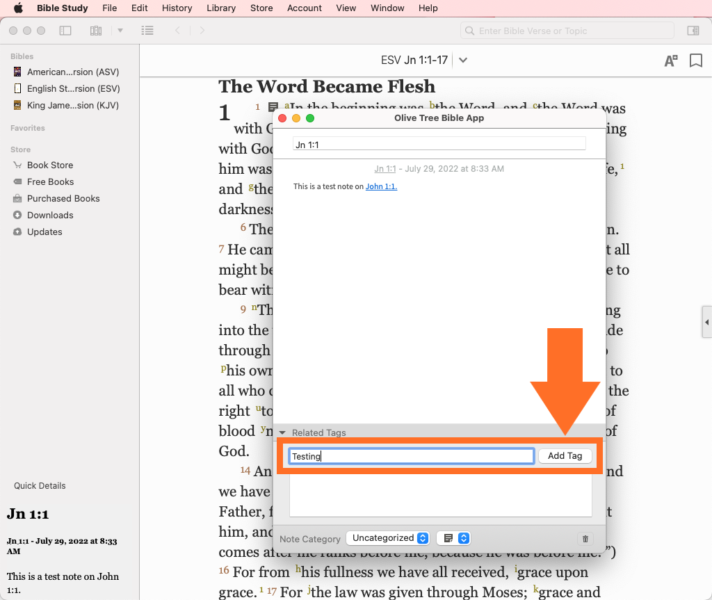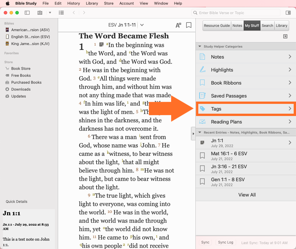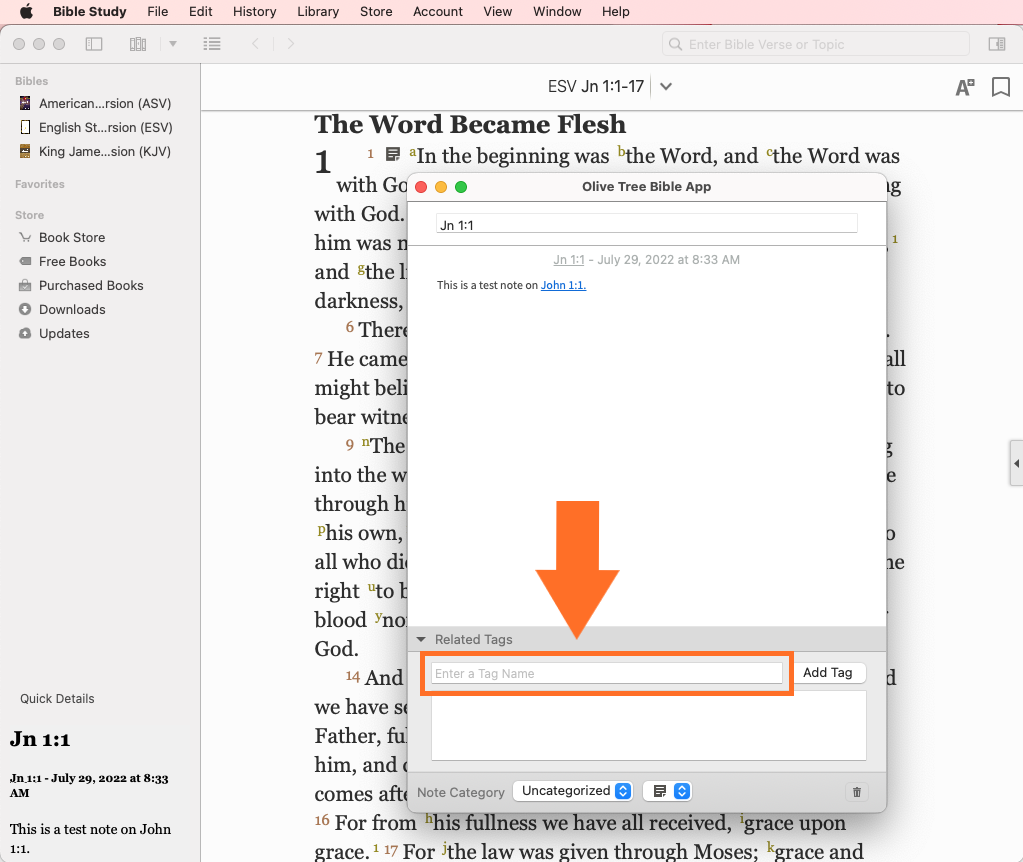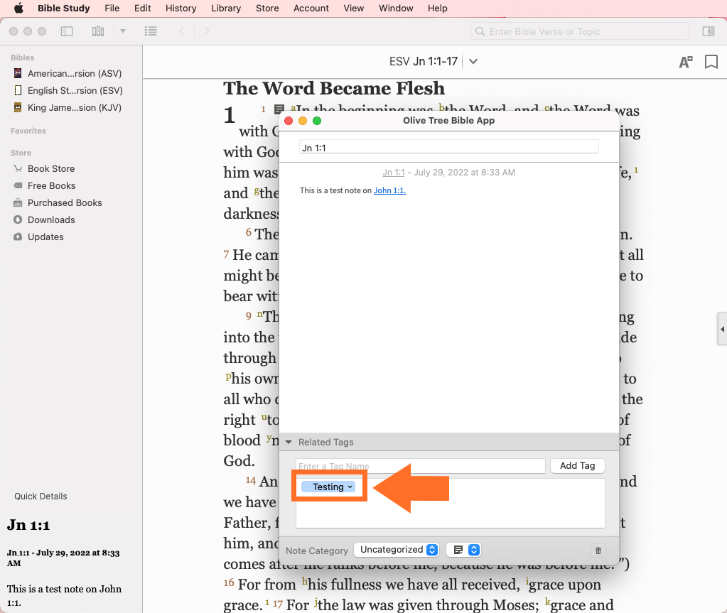 Tags are a tool to help you link your annotations (notes, highlights, saved passages) to topics. With tags, you will easily be able to access other annotations (notes, highlights, and saved passages) you have created that relate to the annotation you are currently reviewing.