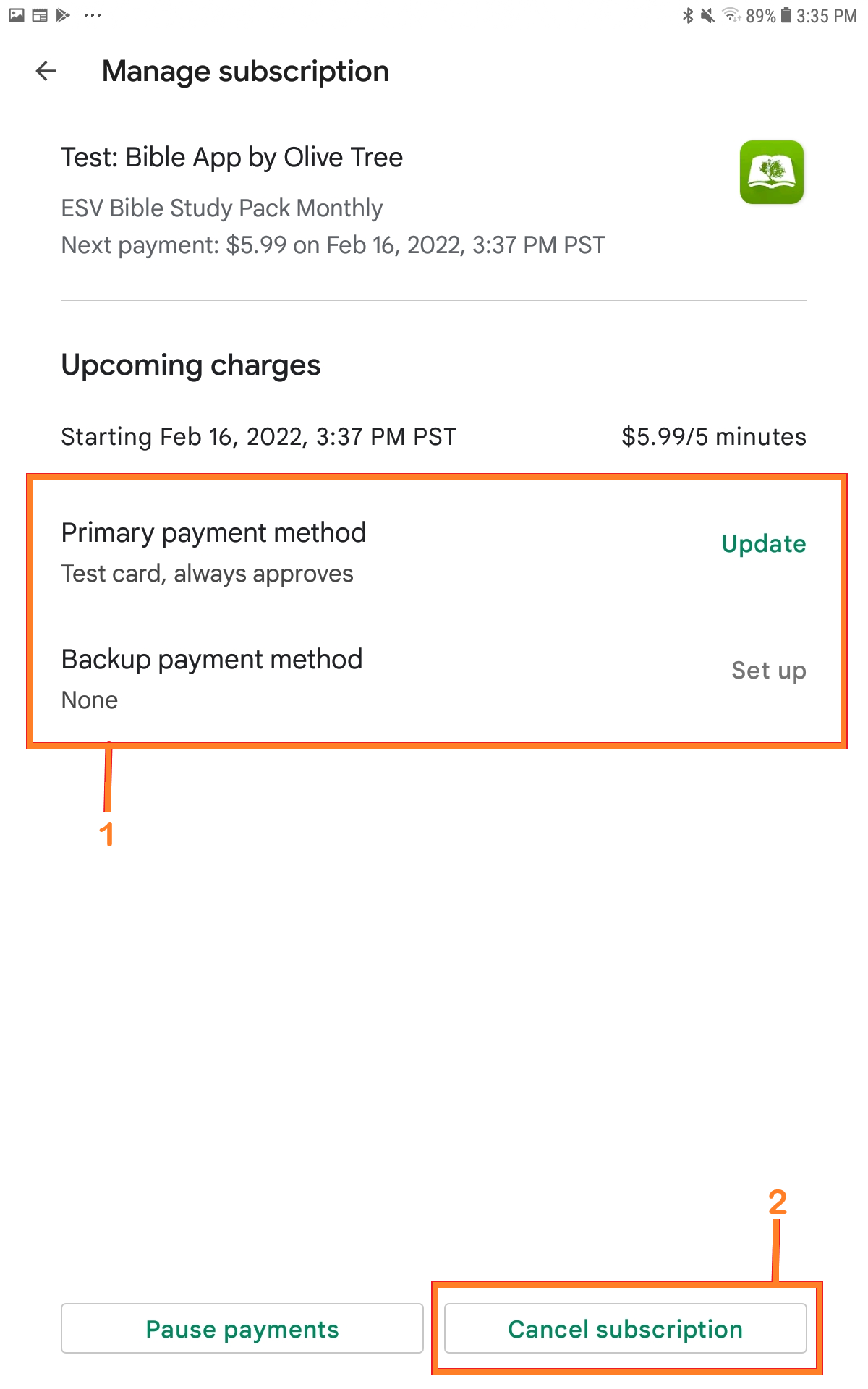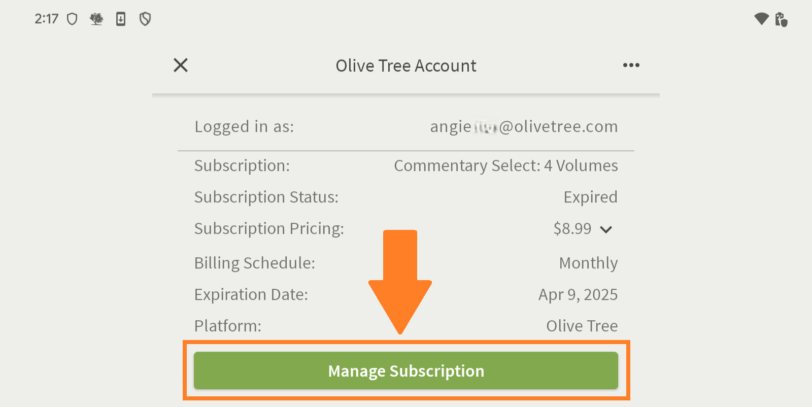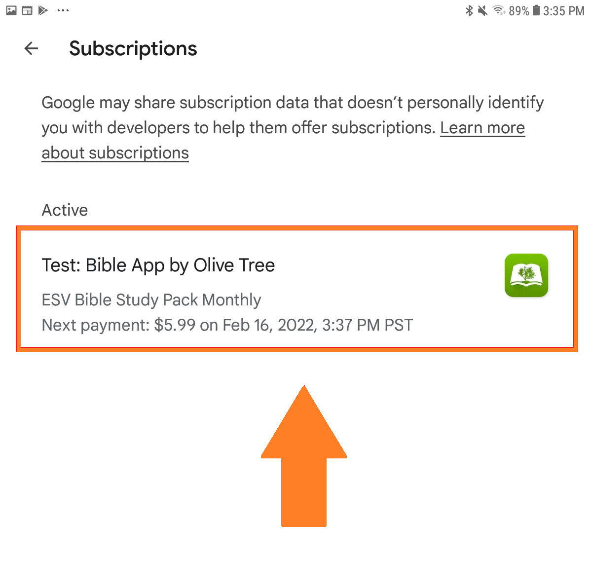 Here are the steps to manage a Google Play subscription from within the Olive Tree Bible App: