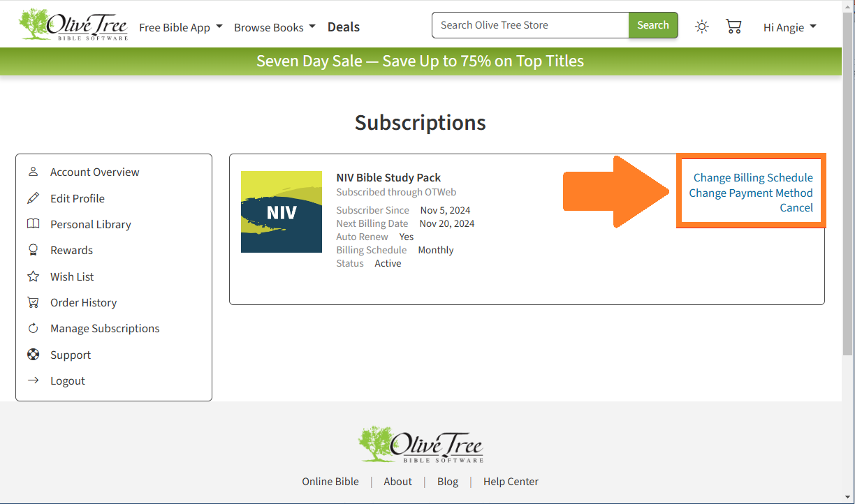 - For subscriptions that were set up on our website, options will appear to Change Billing Schedule, Change Payment Method, or Cancel.