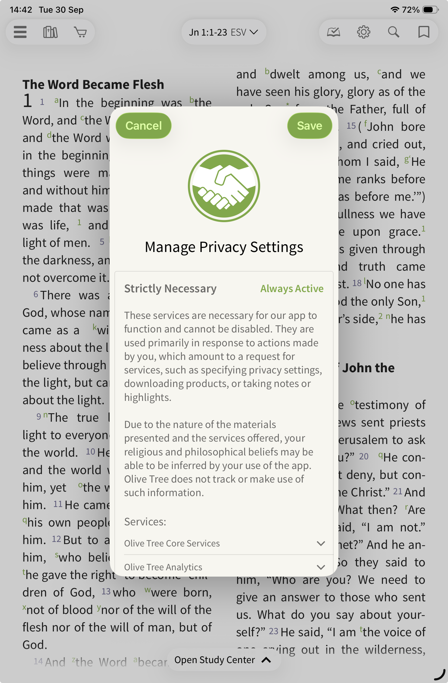 Push notification (if user enabled) and Message center within the app allow us to send messages about features and products. Some analytics data is collected, including Olive Tree User ID.