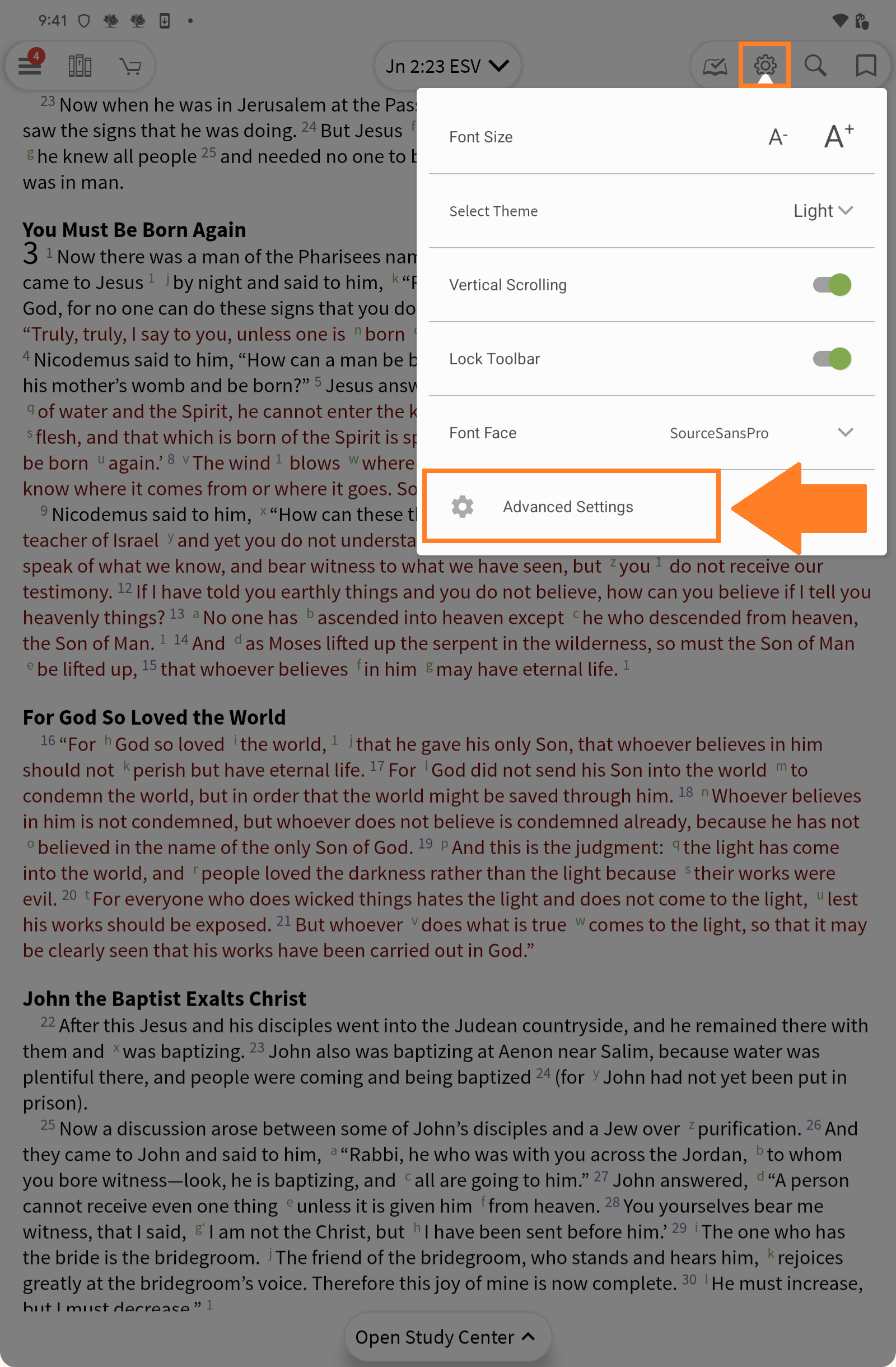 - Tap on Settings icon from the toolbar (gear icon) and Advanced Settings.