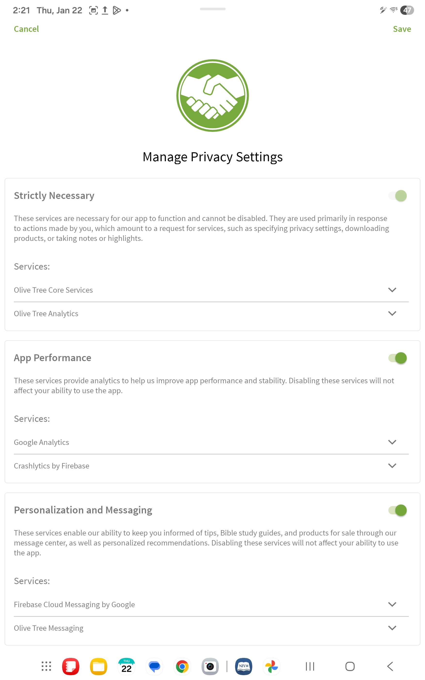 These services enable us to keep you informed of tips, Bible study guides, and products for sale through our Message center and offer personalized product recommendations. Disabling these services will not affect your ability to use the app.