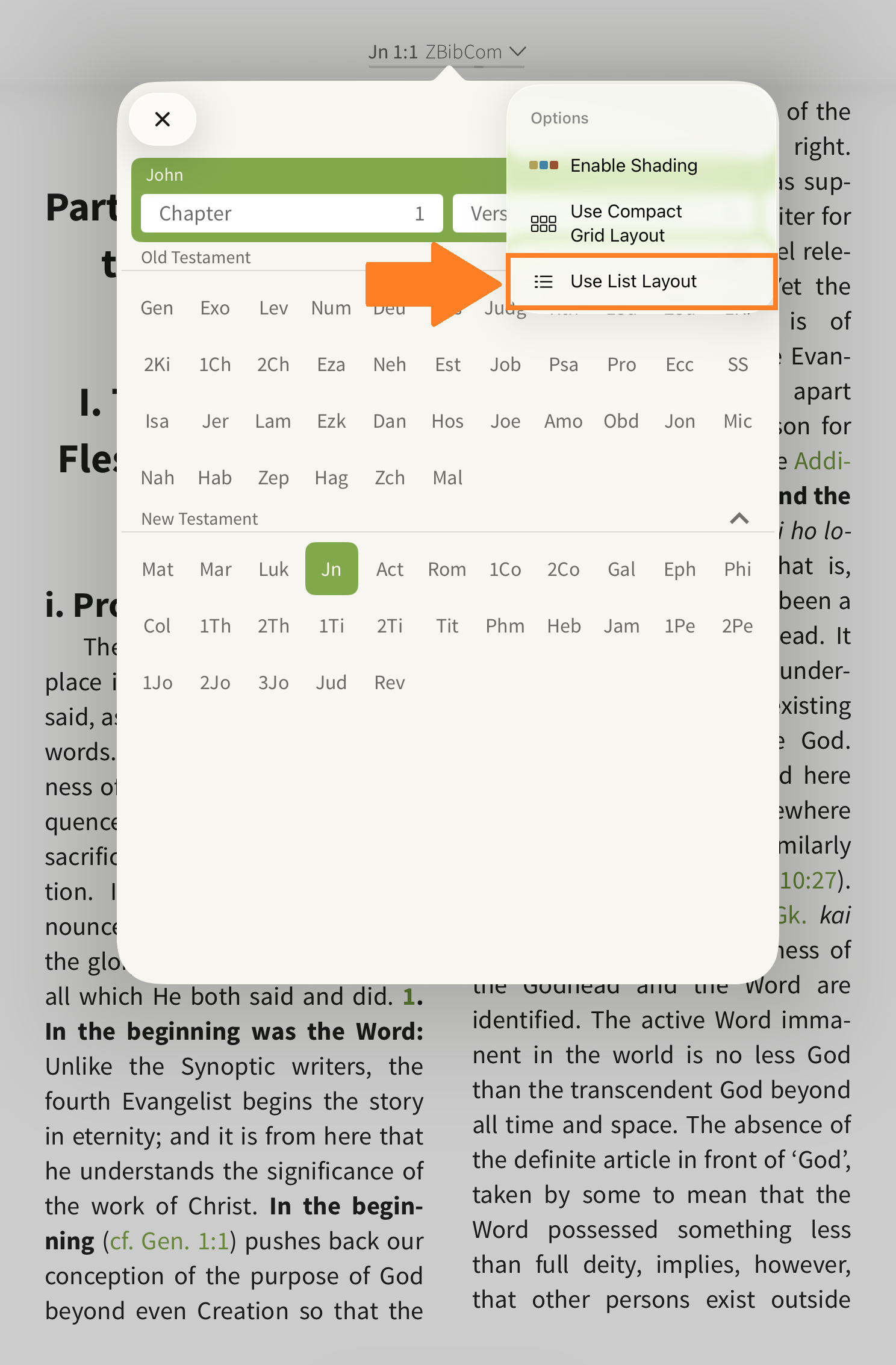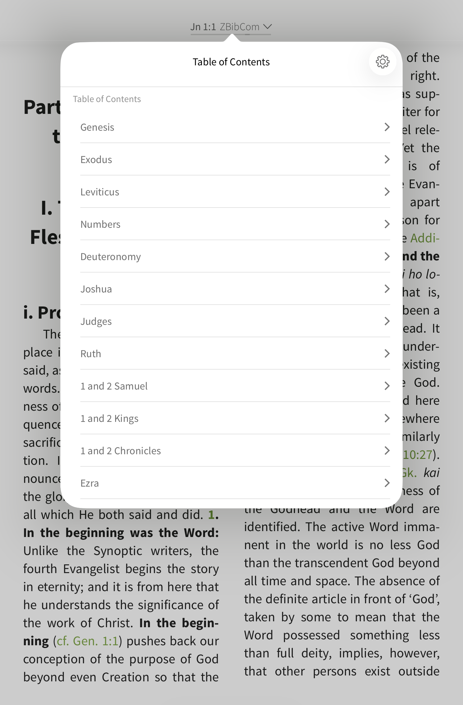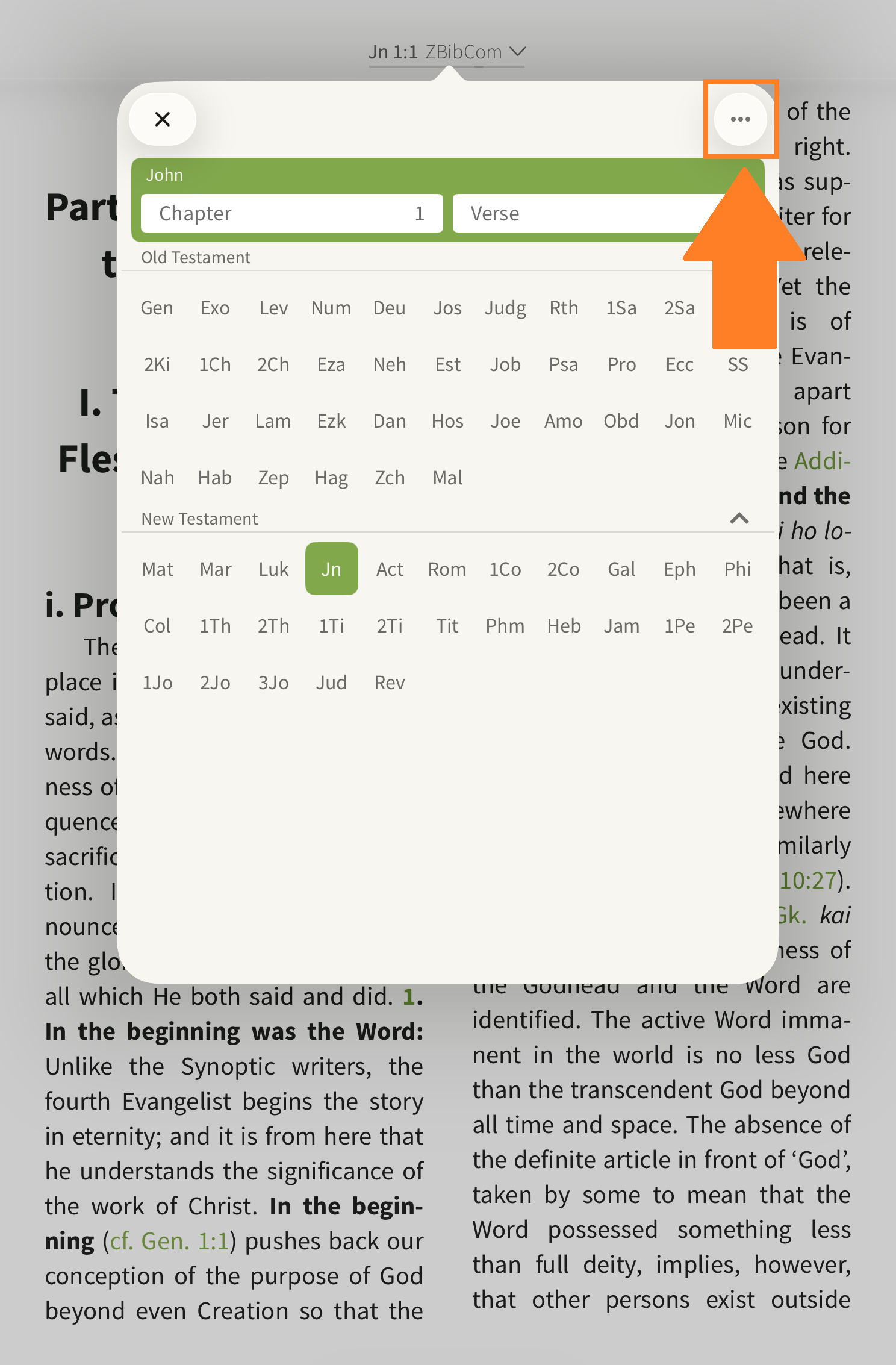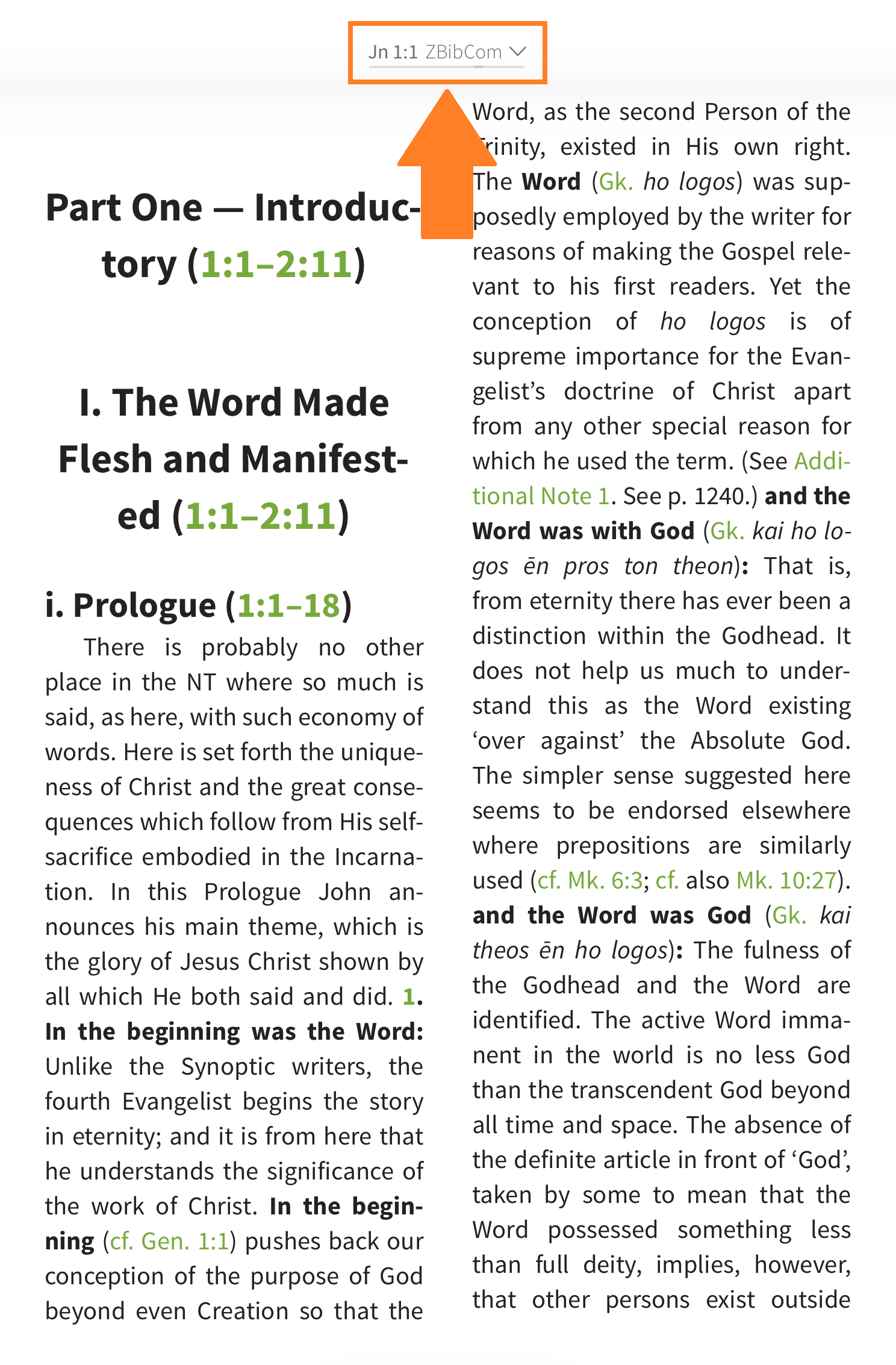 Tap on the commentary in your Library to open it in the main window. This option will allow you to navigate into the Table of Contents for this resource. To access the Table of Contents, simply tap on the navigation menu.