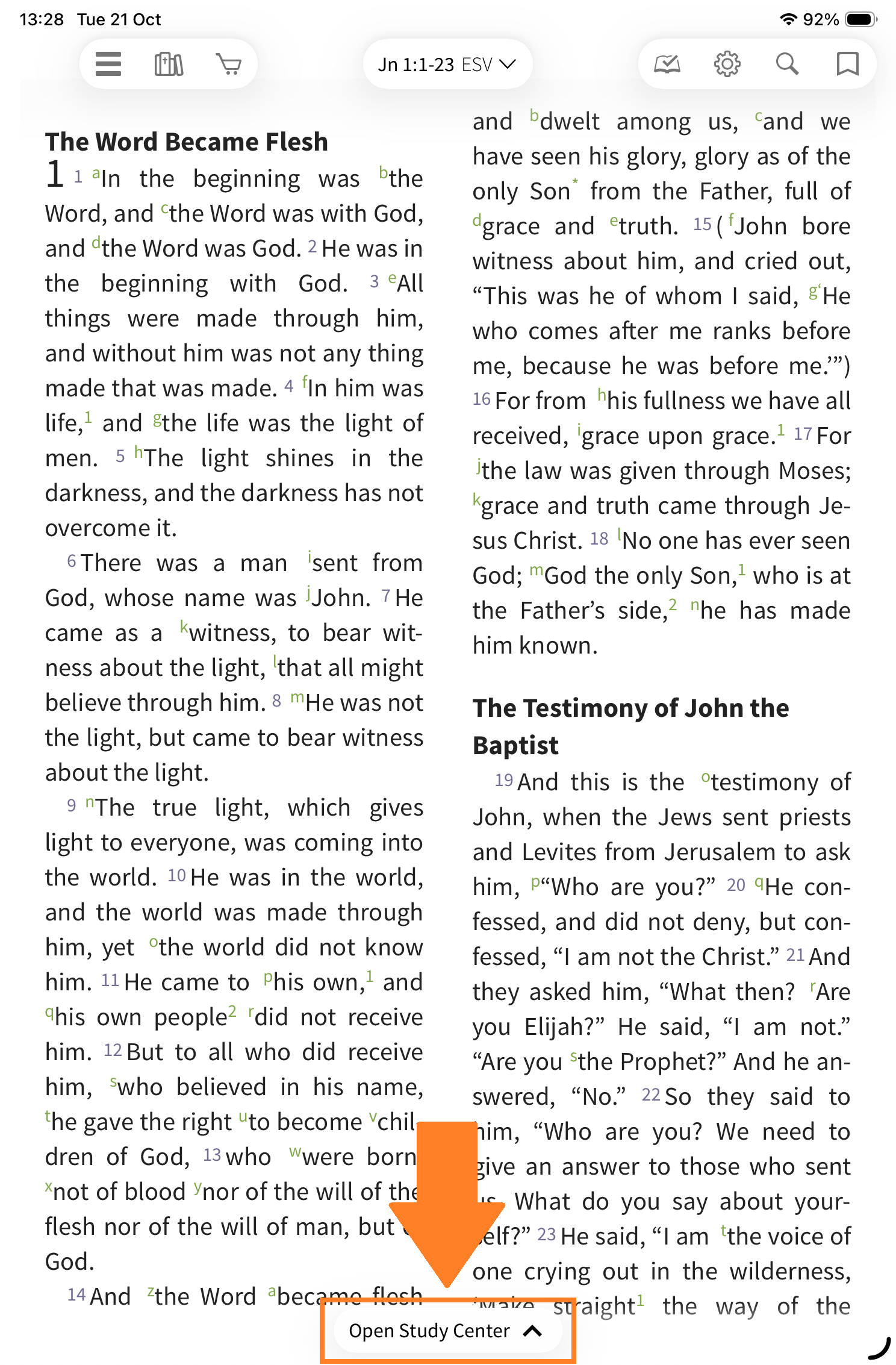 You can also open your preferred Bible translation in the main window and have the Resource Guide open in the Study Center. First, open the Study Center: