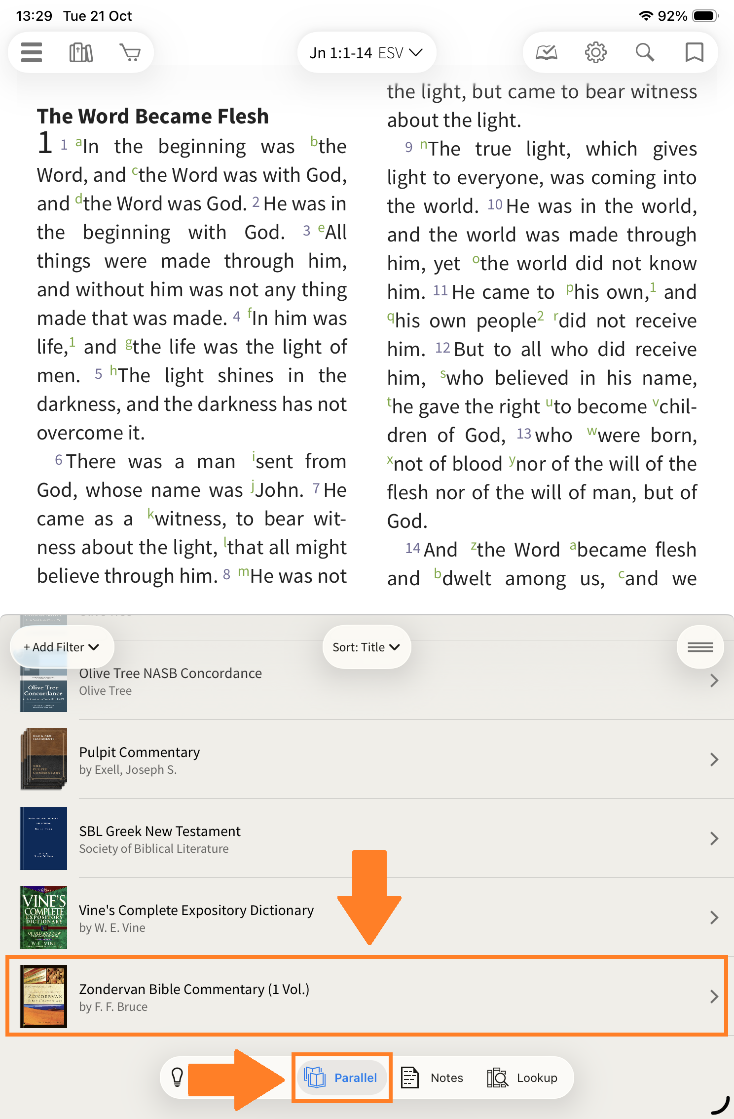 Tap Parallel. Use the 'Sort' filter at the top of the screen to sort the Library list by Title, Author, or Recent to locate the commentary in the list of your resources. You can also use +Add Filter to quickly locate a book or Bible by its category.