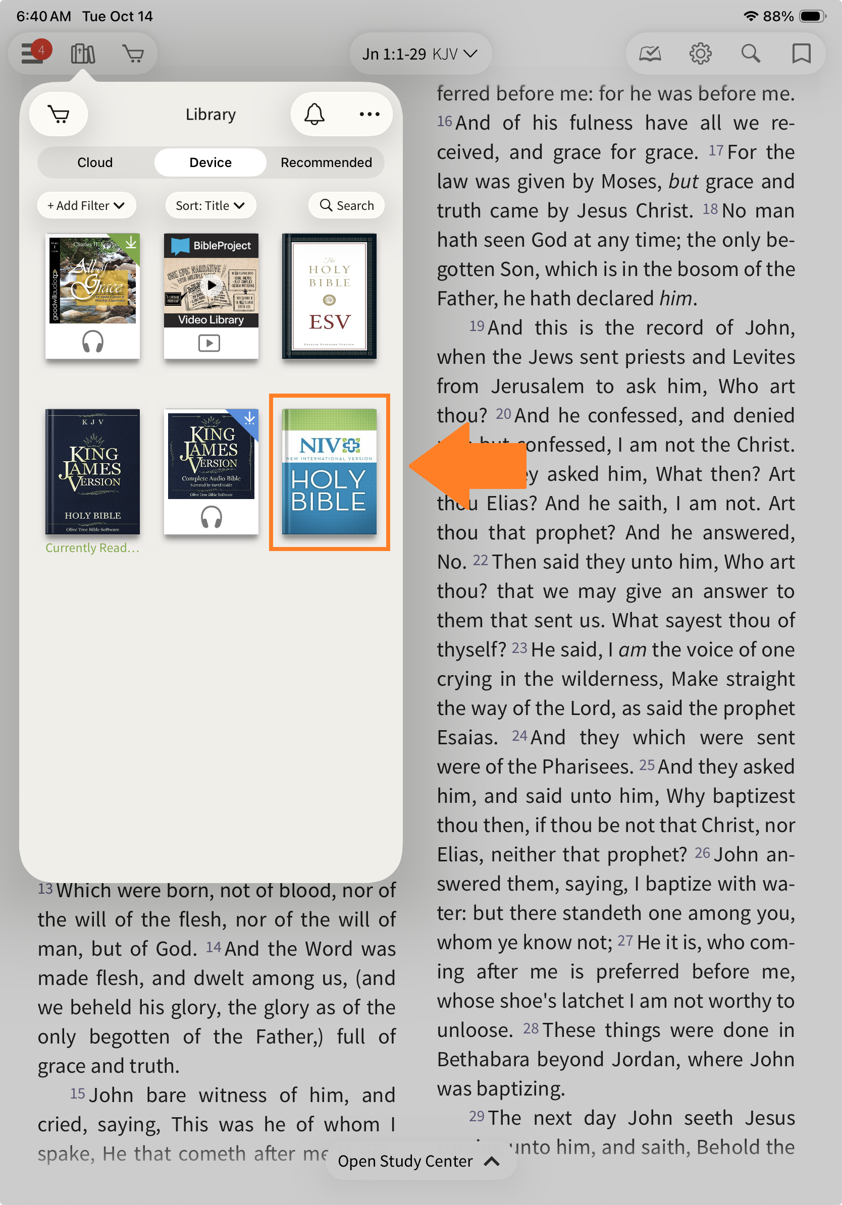 When you select the Bible cover image and/or title, this Bible will display in your main reading window.