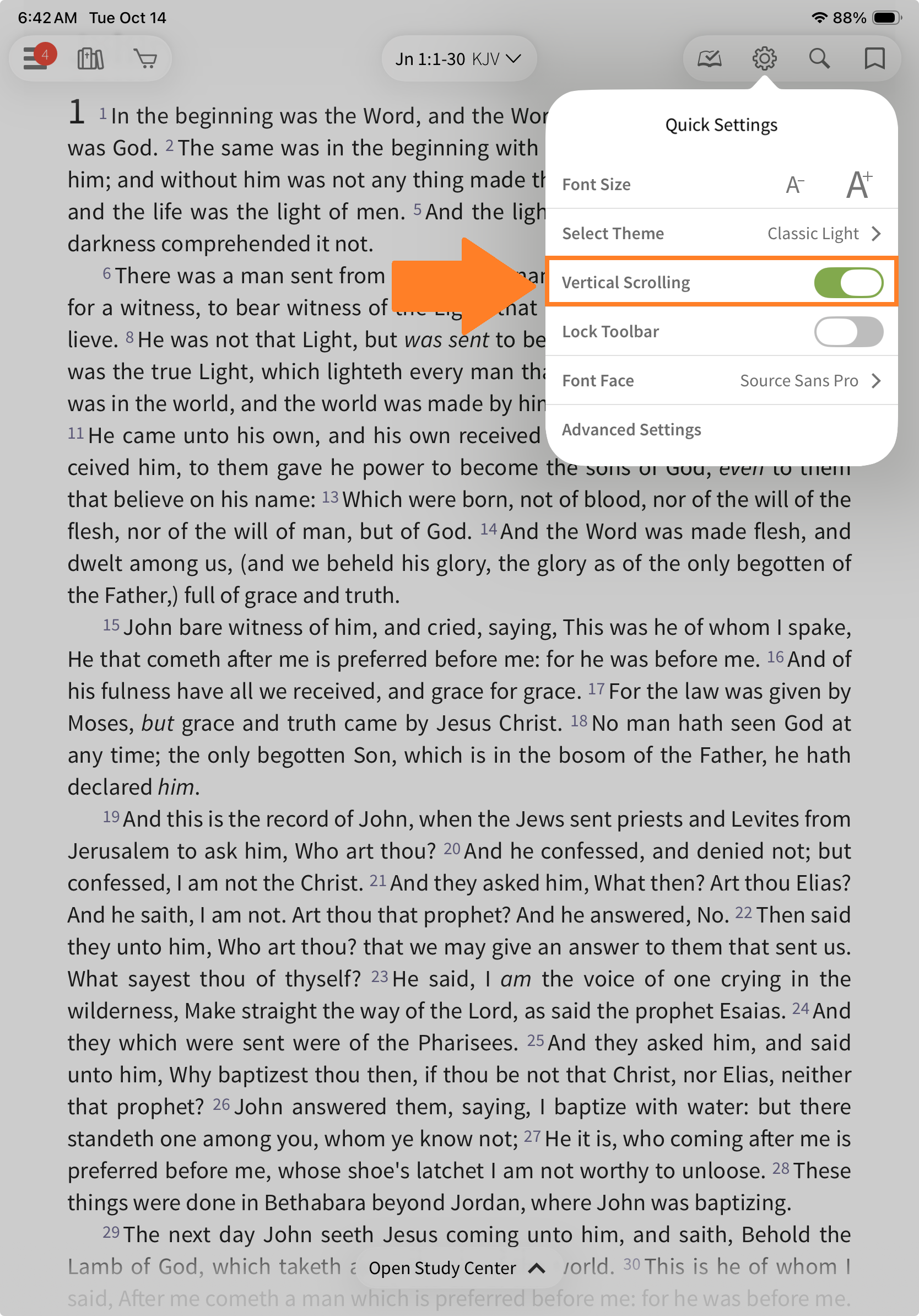 We have two different ways to scroll through the Bible text or any other book you have open within the Olive Tree Bible App. One way is Flick Scrolling (up/down) and the other way is Page Scrolling (left/right). To choose your preferred method, follow the steps below.